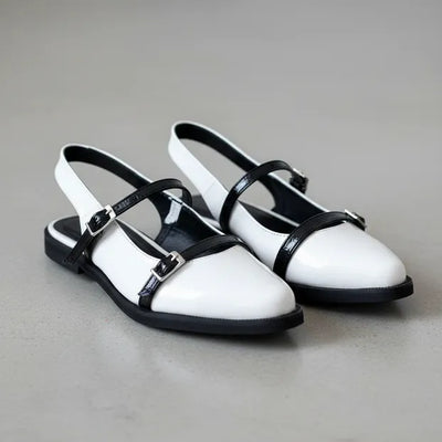 ZUECOS TRINIDAD CHAROL BLANCO con 2 TIRAS PARALELAS CHAROL NEGRO HEBILLAS - LINEA LUXURY