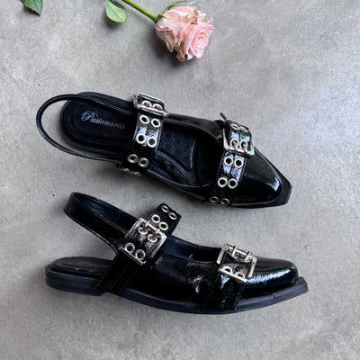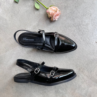 ZUECOS PILAR CHAROL NEGRO con 2 TIRAS CRUZADAS HEBILLAS - LINEA LUXURY