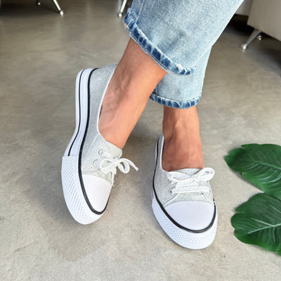ZAPATILLAS CHATAS NARCIZA PLATA ACORDONADAS DE LONA CON GLITERS