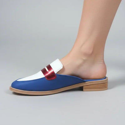 ZUECOS ISABEL MARINERO SIMIL CUERO Tipo SLIPPERS COMBINADO AZUL, BLANCO, VINCHA ROJA