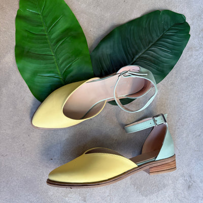 CHATITAS GUILLERMINA NINITA PUNTA FINA COMBINADO AMARILLO CORTE CORAZÓN TALON Y PULSERA VERDE (Ed. LIMITADA)