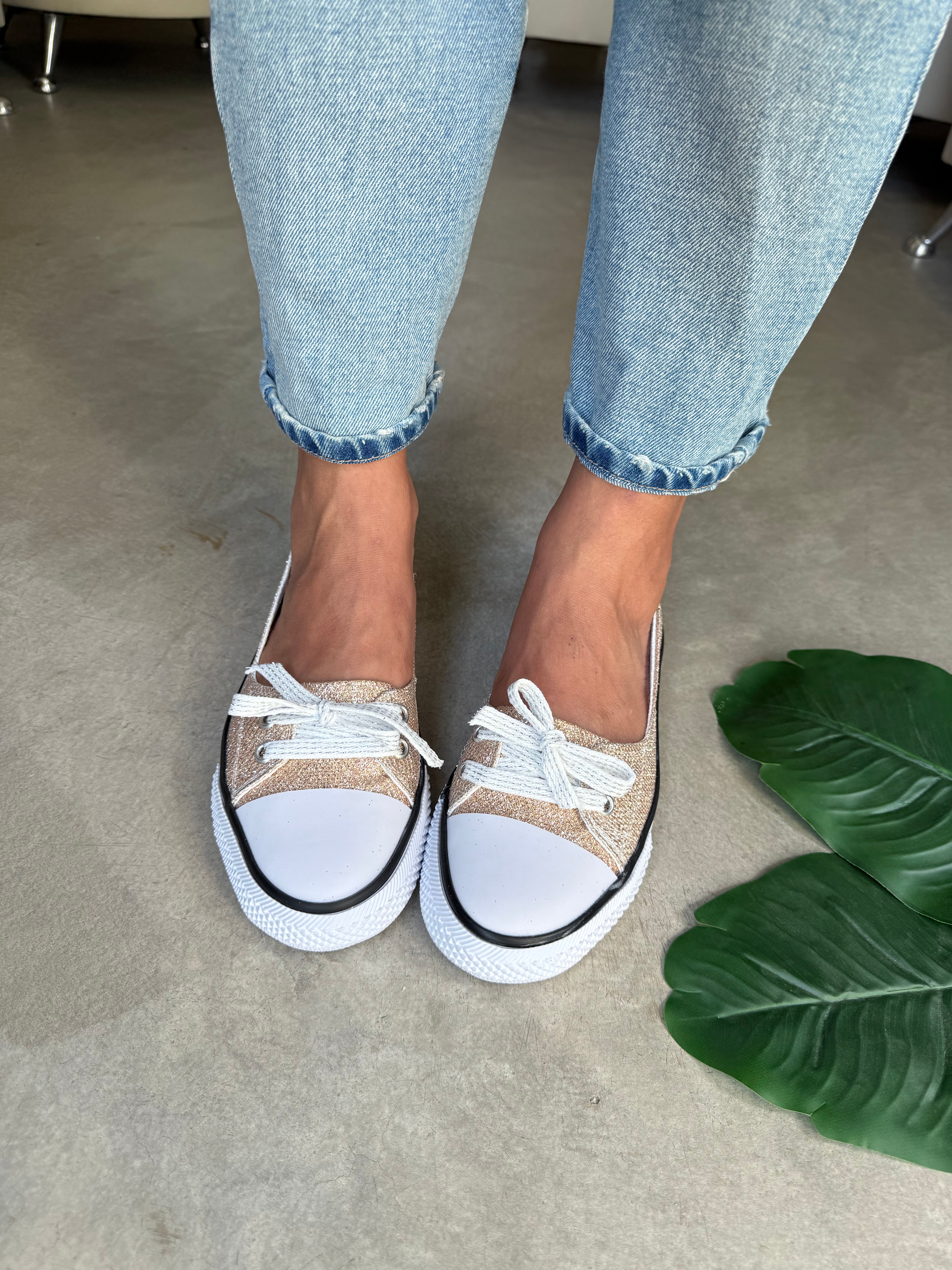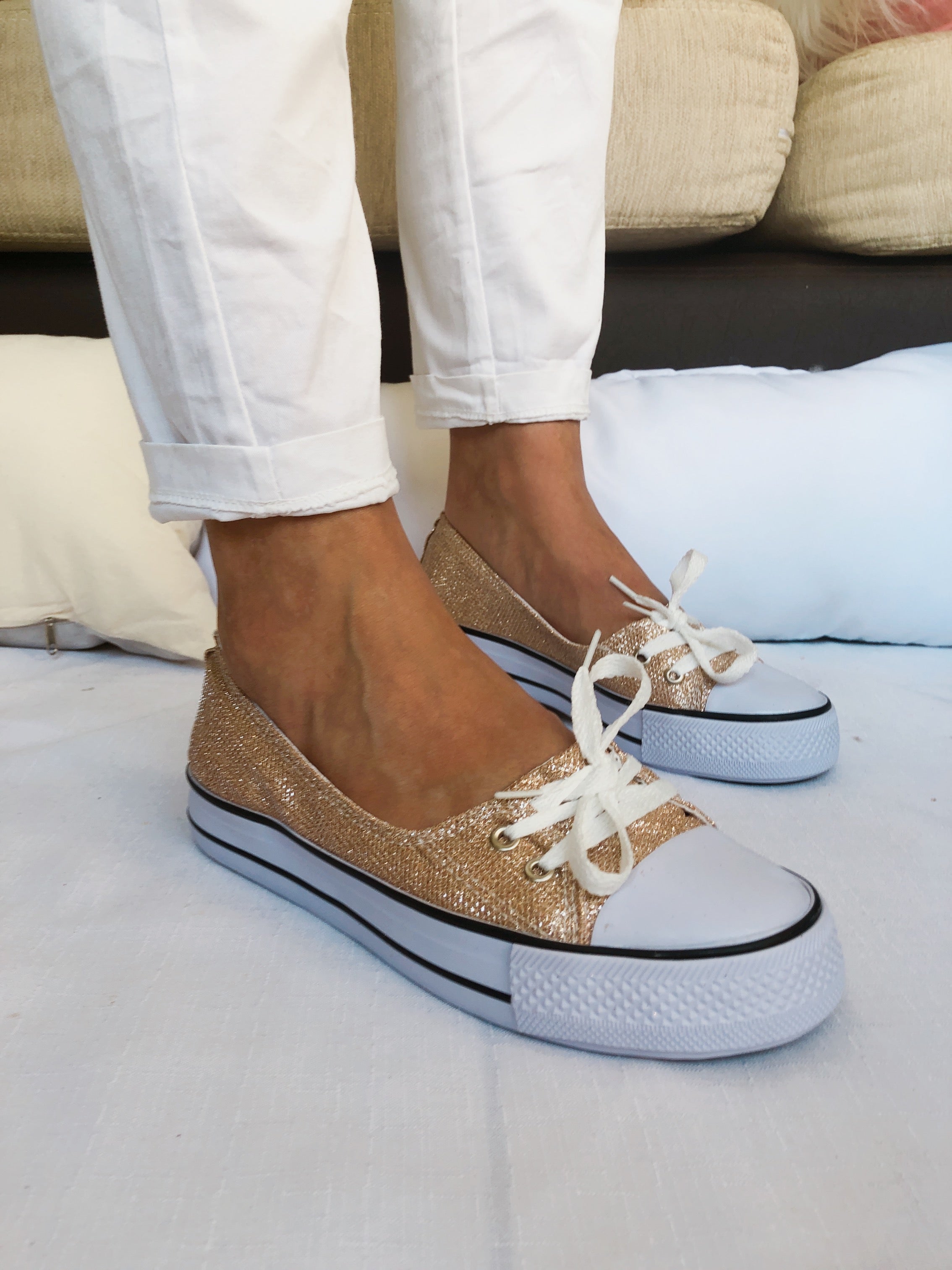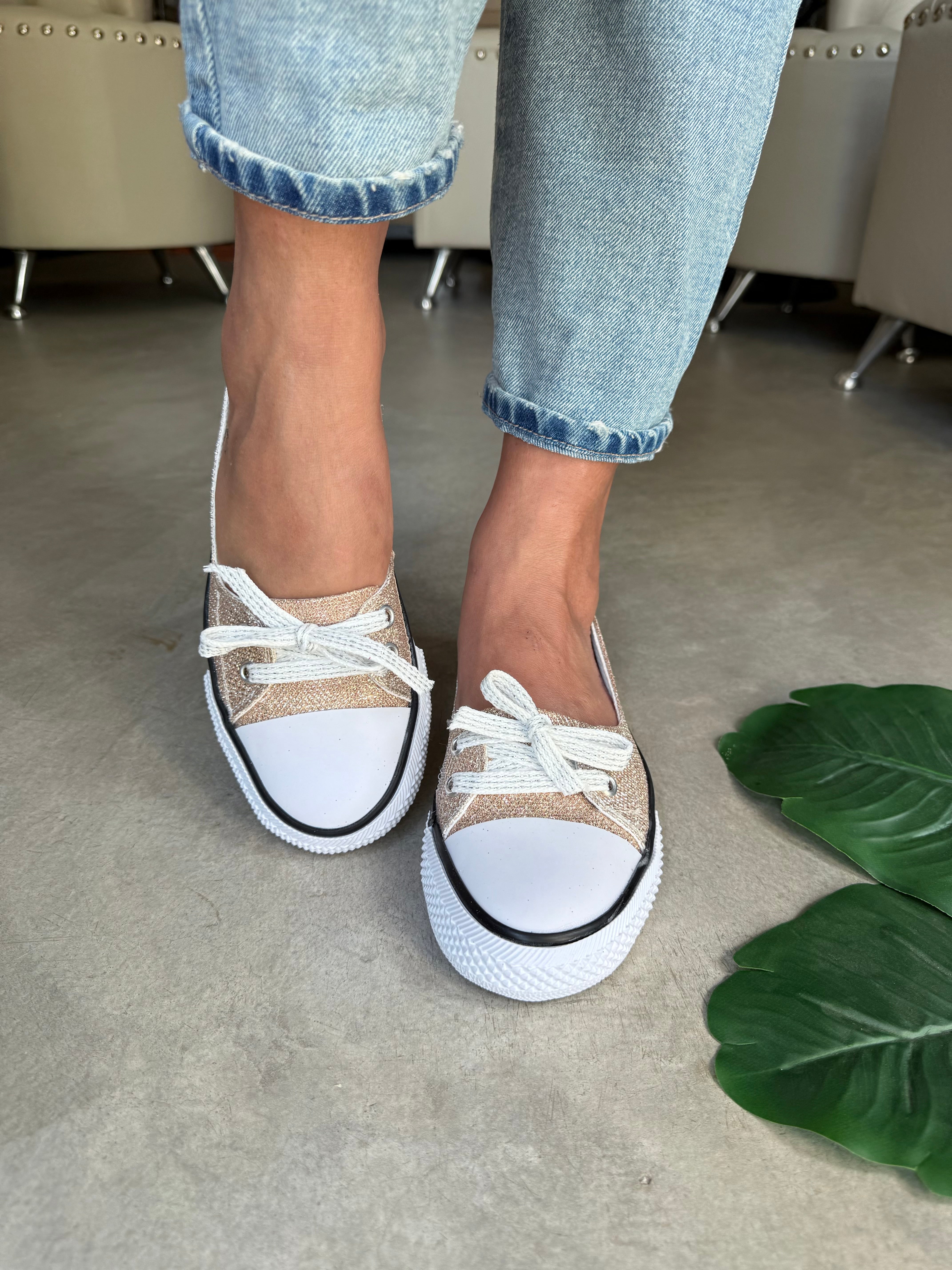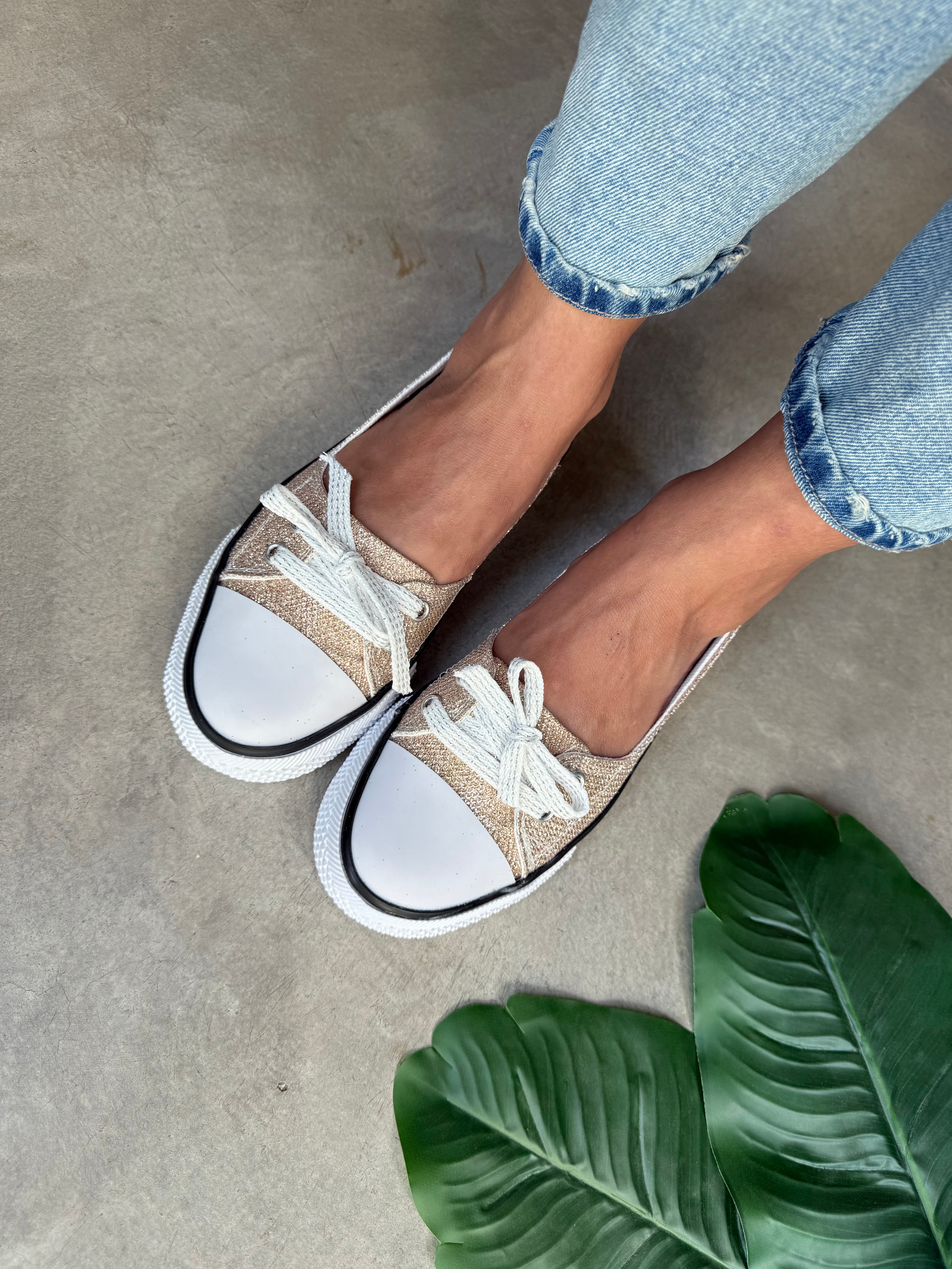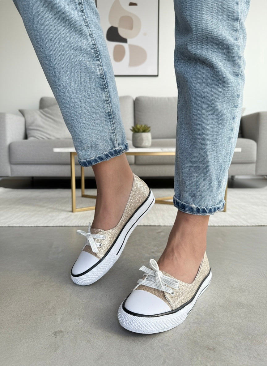 ZAPATILLAS CHATAS NARCIZA COBRE ACORDONADAS DE LONA CON GLITERS
