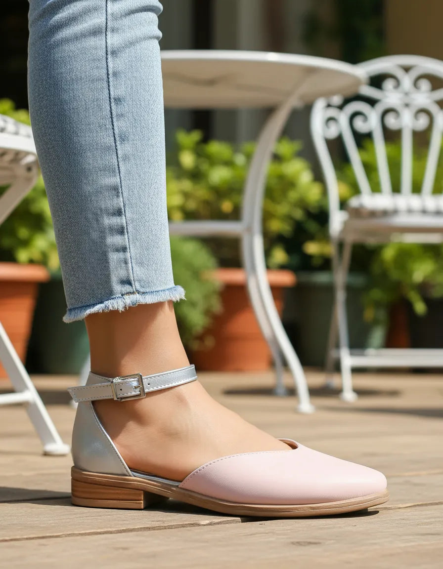 - Material: Símil Cuero combinado con rosa en la punta y plata en talonera y pulsera