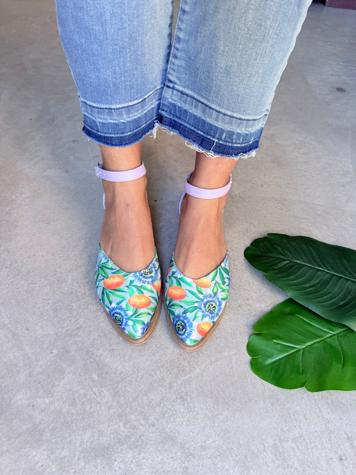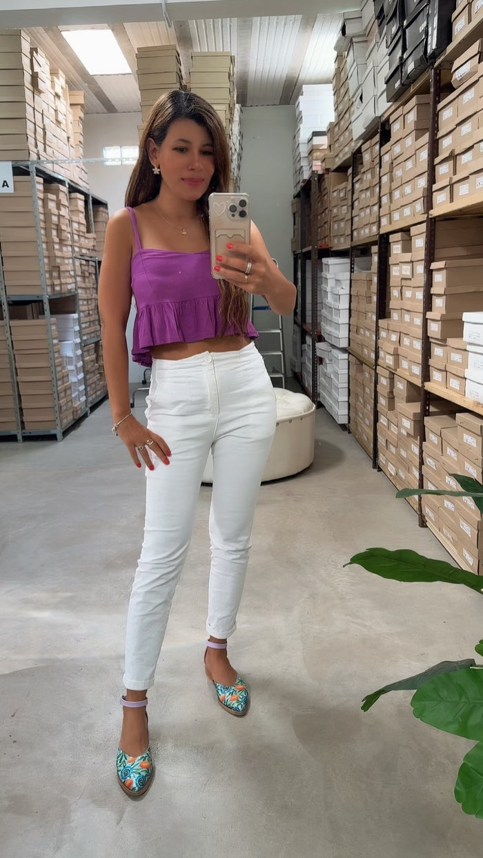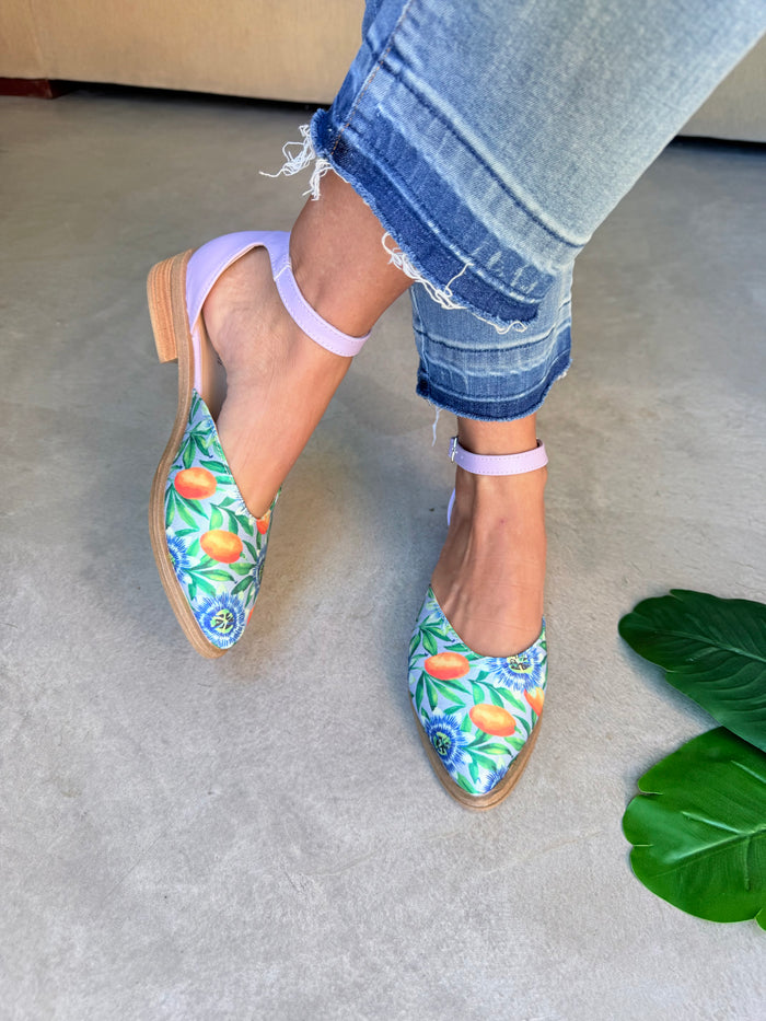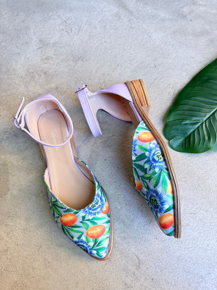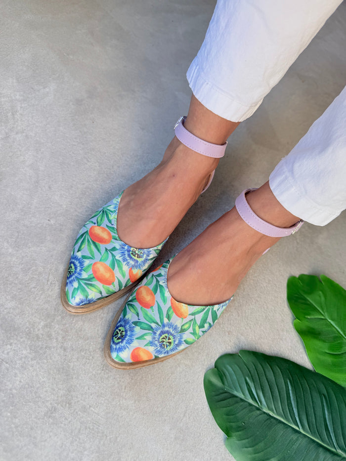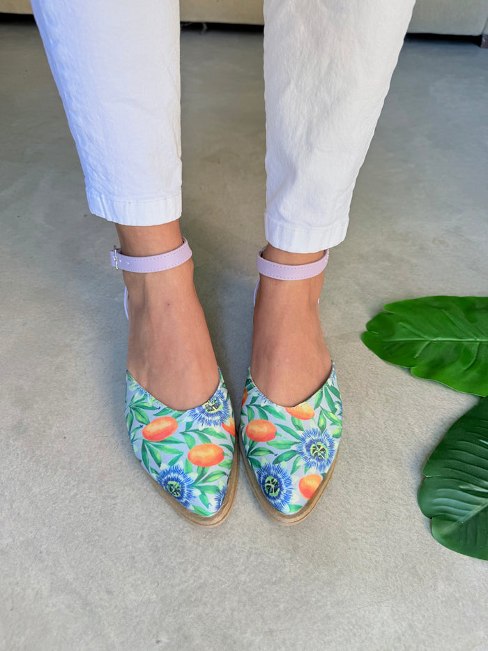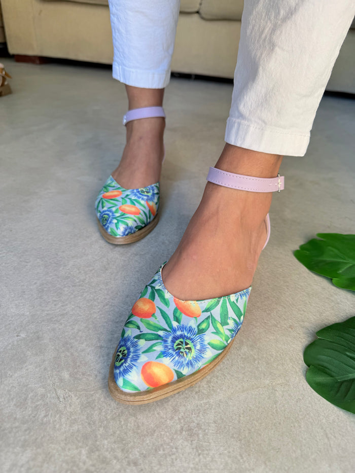 - Material: Tela símil gabardina estampada Mburucuyá en la punta, combinado con sintético talón y pulsera