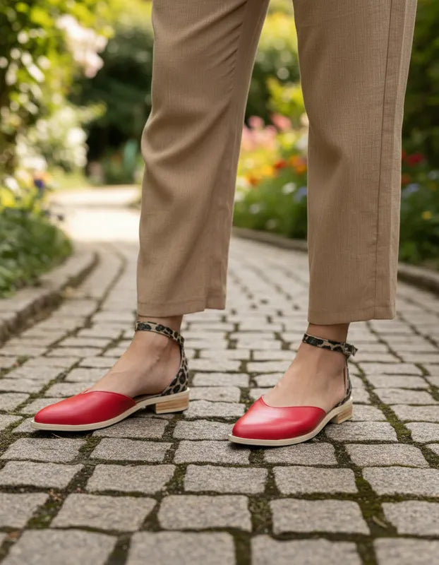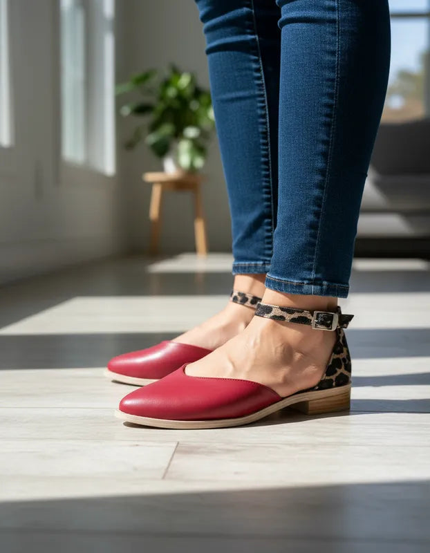 - Material: Símil Cuero combinado con rojo en la punta y animal print  en la talonera y pulsera