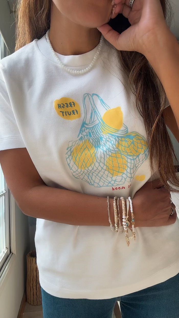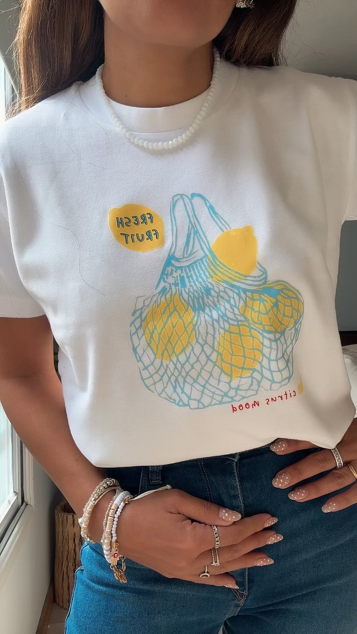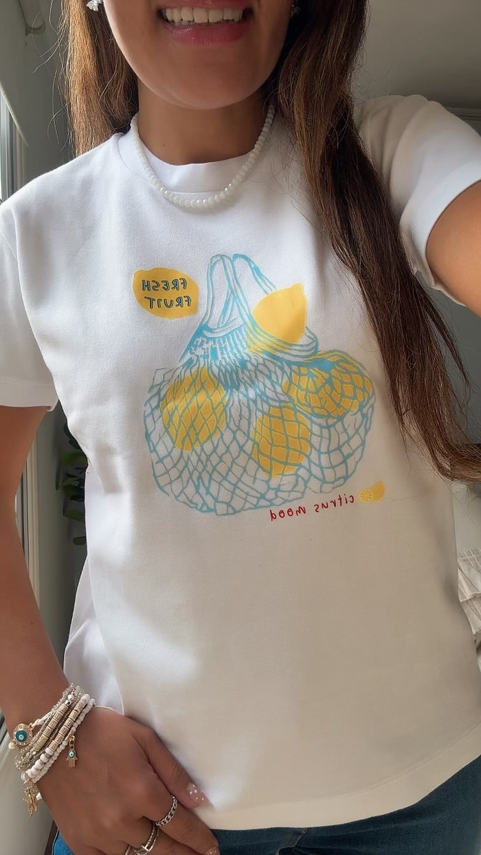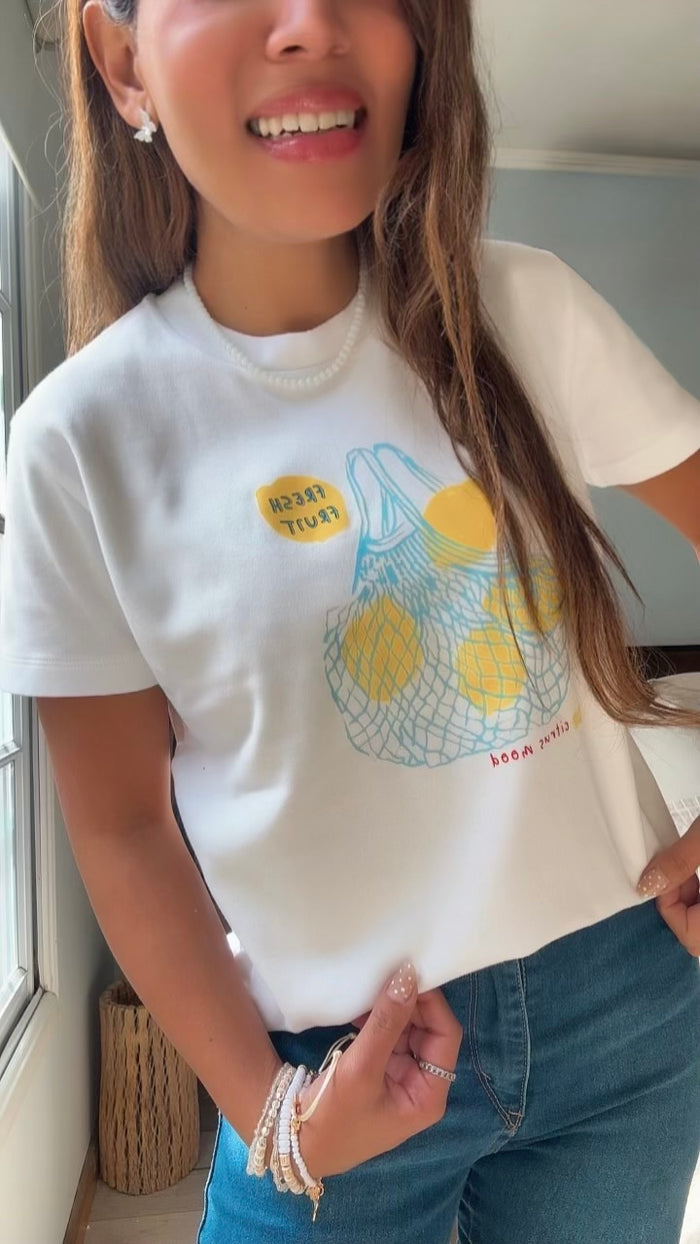 REMERA FREST FRUIT BLANCO MANGA CORTA DE ALGODÓN ESTAMPADA Cuello Redondo (Linea Amalfi)