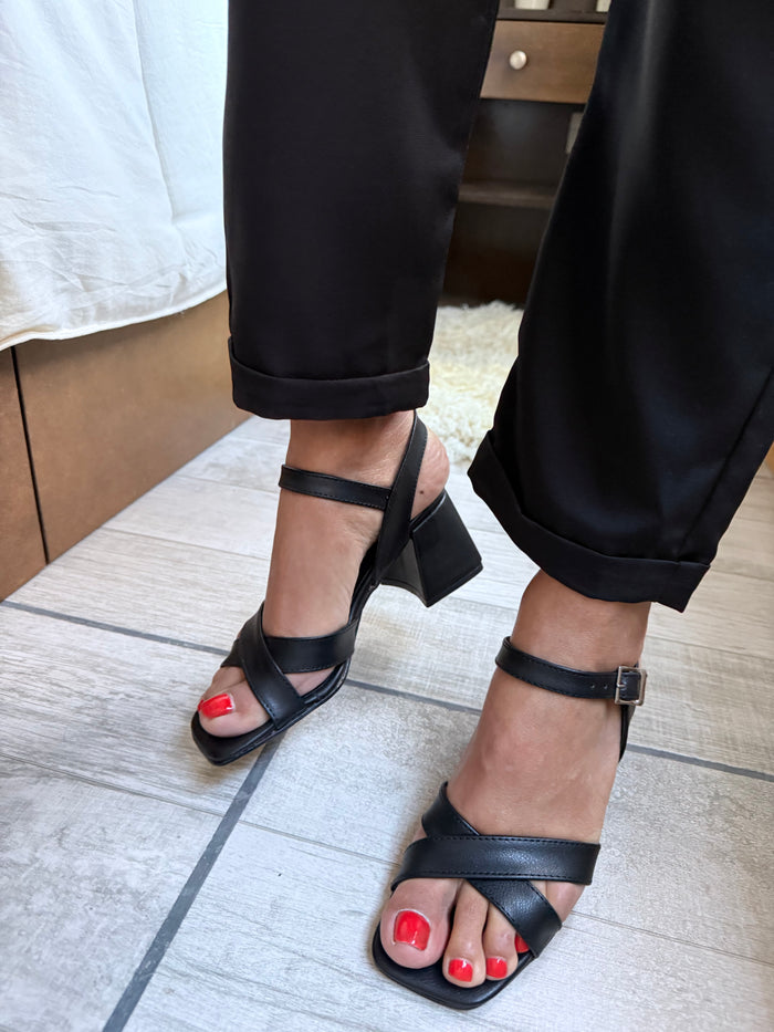 SANDALIAS AMARAL con FAJAS CRUZADAS TACO CUADRADO y PULSERA (NEGRO PU)