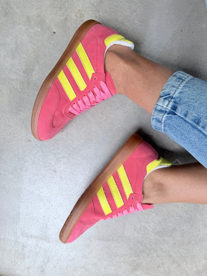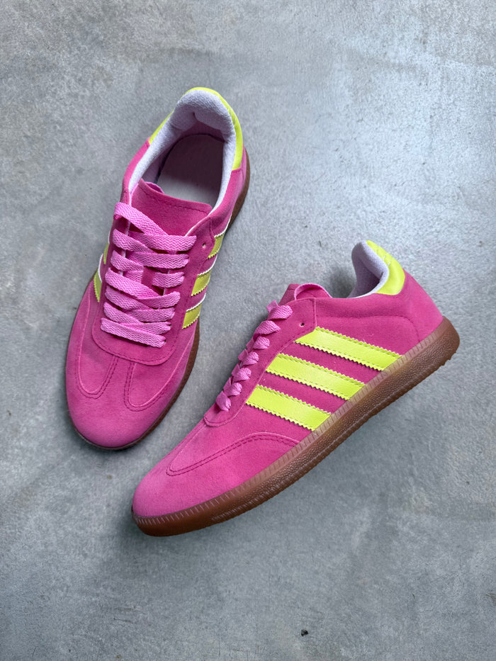 Mod. Pasionaria tienda de zapatos PAMPA (Art. SAM) INFORMACIÓN DEL PRODUCTO: Material: Símil gamuza Color: fucsia con amarillo lima Altura plataforma: 2 cm Detalles de color amarillo lima en el...