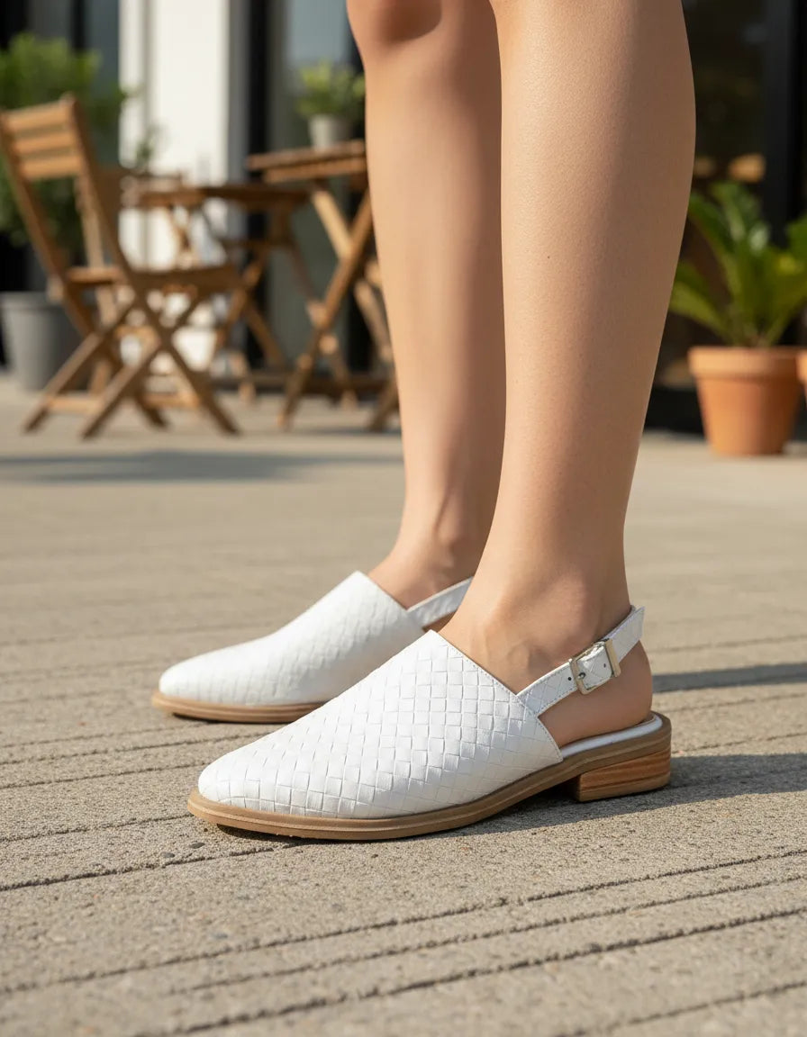 Mod. EMA(Art.621) INFORMACIÓN DEL PRODUCTO Color: Blanco Material: Tramado Ecocuero  Pulsera al talón con hebilla regulable Base goma expanso Taco: 2 cm.
