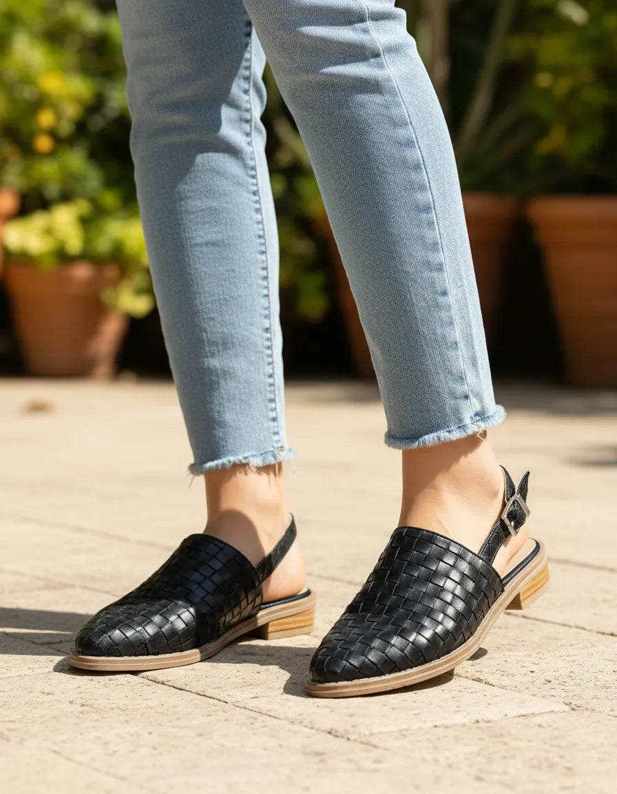Mod. EMA(Art.621) INFORMACIÓN DEL PRODUCTO Color: Negro Material: Tramado Ecocuero  Pulsera al talón con hebilla regulable Base goma expanso Taco: 2 cm.