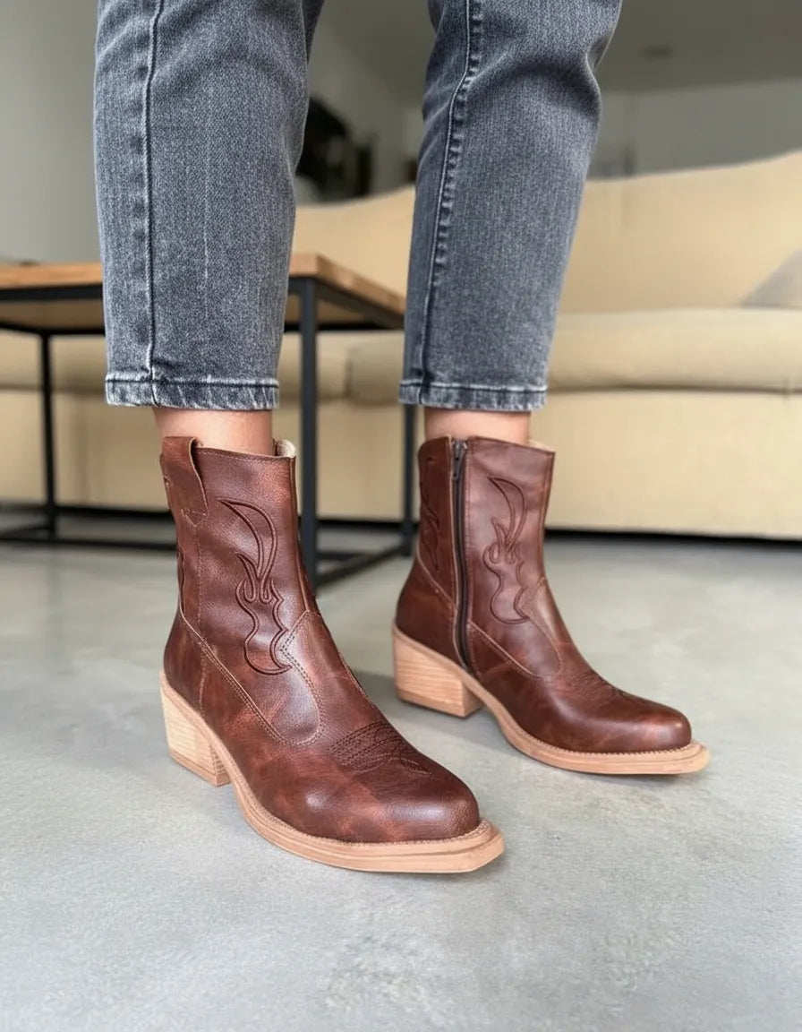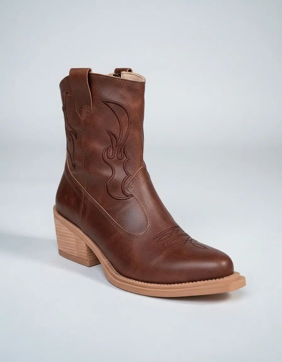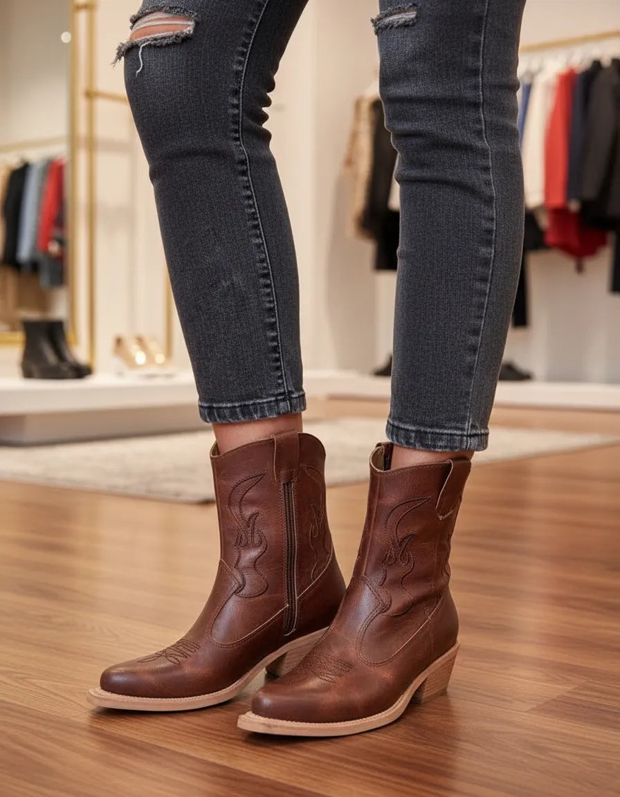 BOTAS TEXANAS MYRA CHOCOLATE BORDADA PUNTA FINA CIERRE LATERAL CHOCOLATE