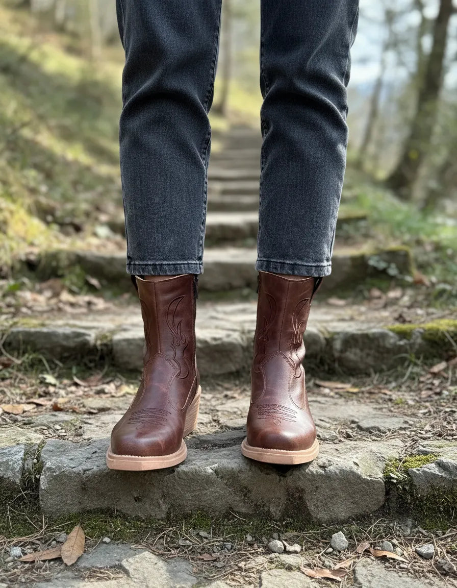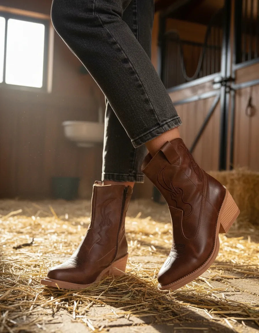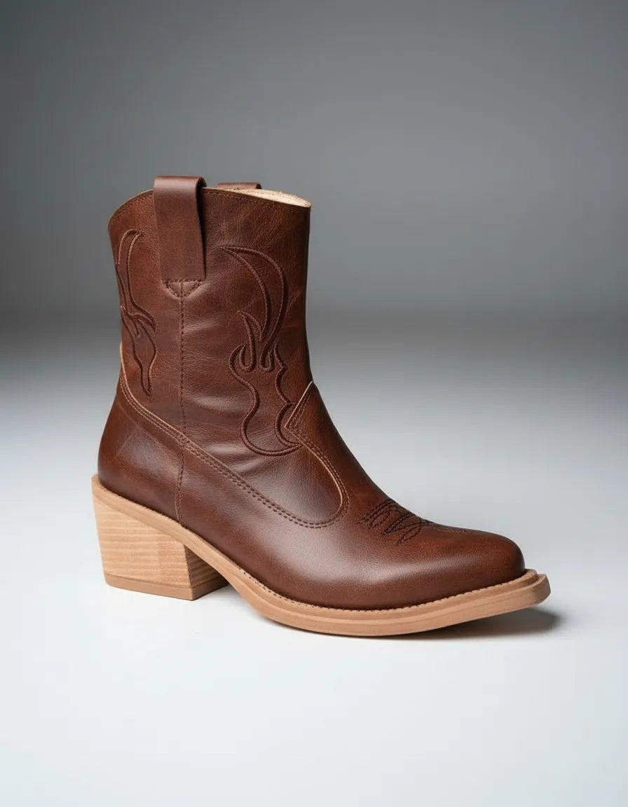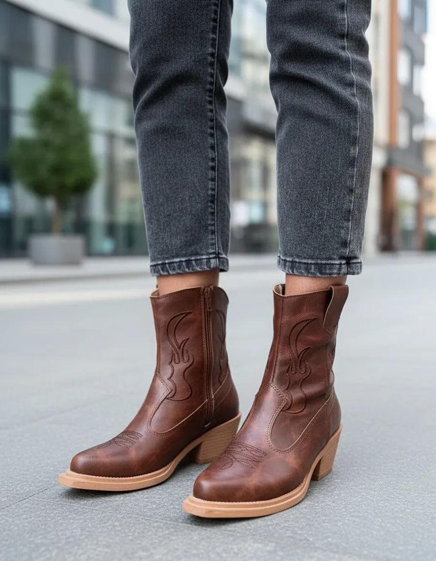 BOTAS TEXANAS MYRA CHOCOLATE BORDADA PUNTA FINA CIERRE LATERAL CHOCOLATE