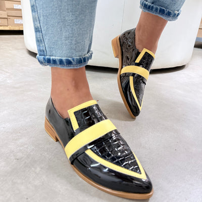 ZAPATOS BAJOS CAROLINA AMARILLO NEGRO PUNTA FINA DE CHAROL COMBINADO con VINCHA