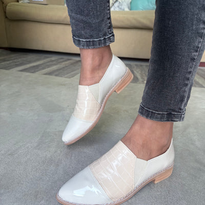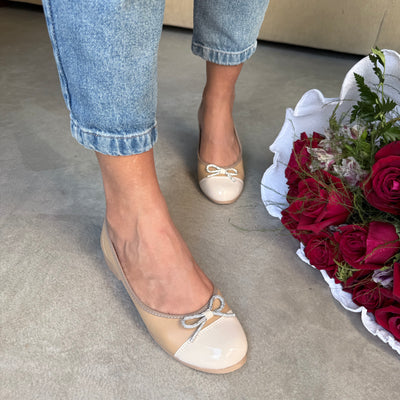 ZAPATOS CHATITAS PIPINA BEIGE CON NUDE PUNTA FINA CHAROL