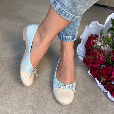 CHATITAS BALLERINA OFELIA CELESTE PU PUNTA REDONDA CHAROL BEIGE Detalle CORDÓN