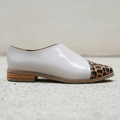 ZAPATOS BAJO CAROLINA CON VINCHA PUNTA FINA DE CHAROL COMBINADO LEOPARDO