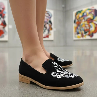 ZAPATOS MOCASINES BAJOS PATI NEGRO GAMUZA BORDADA