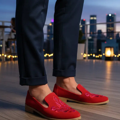 ZAPATOS MOCASINES BAJOS PATI ROJO GAMUZA BORDADA