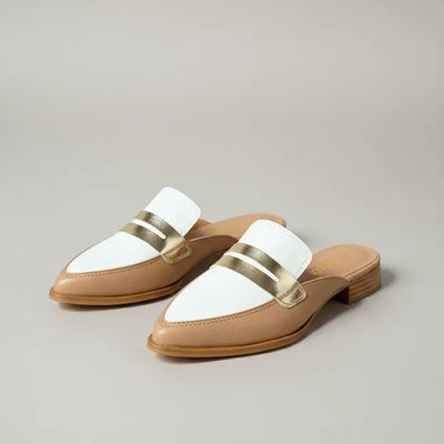 ZUECOS ISABEL SIMIL CUERO Tipo SLIPPERS COMBINADO TERRA, BLANCO Y VINCHA ORO