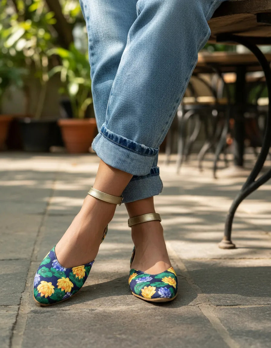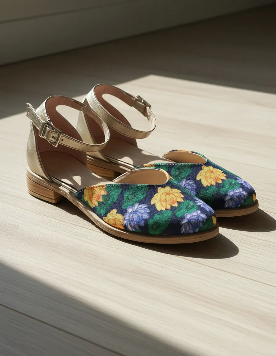 - Material: Tela RASEADA estampada Flores en la punta, combinado con ecocuero oro en el talón y pulsera.