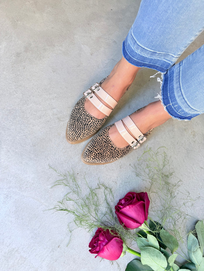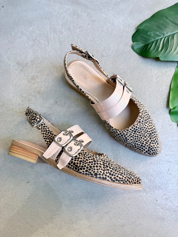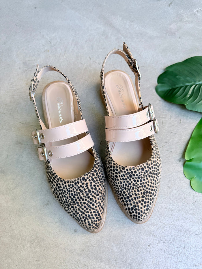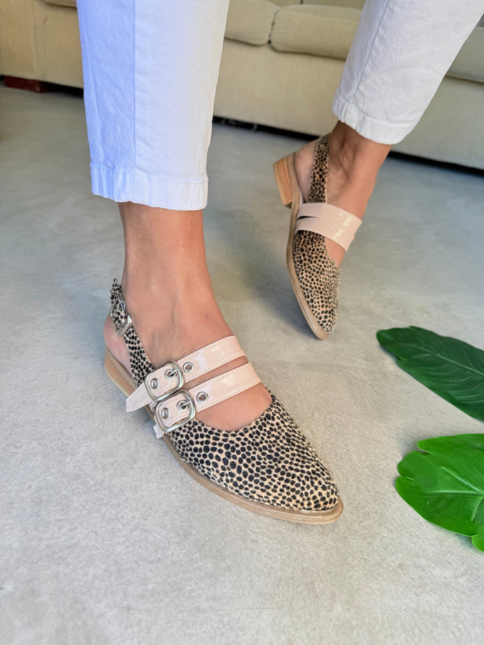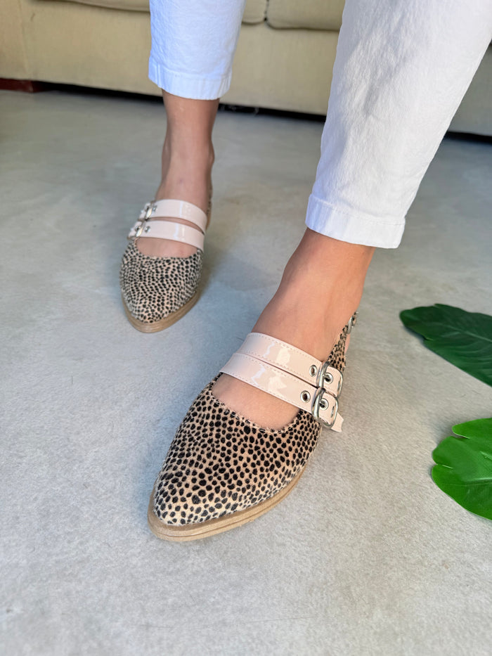 Mod. NEMESIA (Art. Berlín)  INFORMACIÓN DEL PRODUCTO Color: Chita pelo Material: Cuero Ecológico con chita pelo Ojalillos y hebillas: Nude Acharolado Taco: 2 cm. Base: Con antideslizante en goma expanso (Goma)...