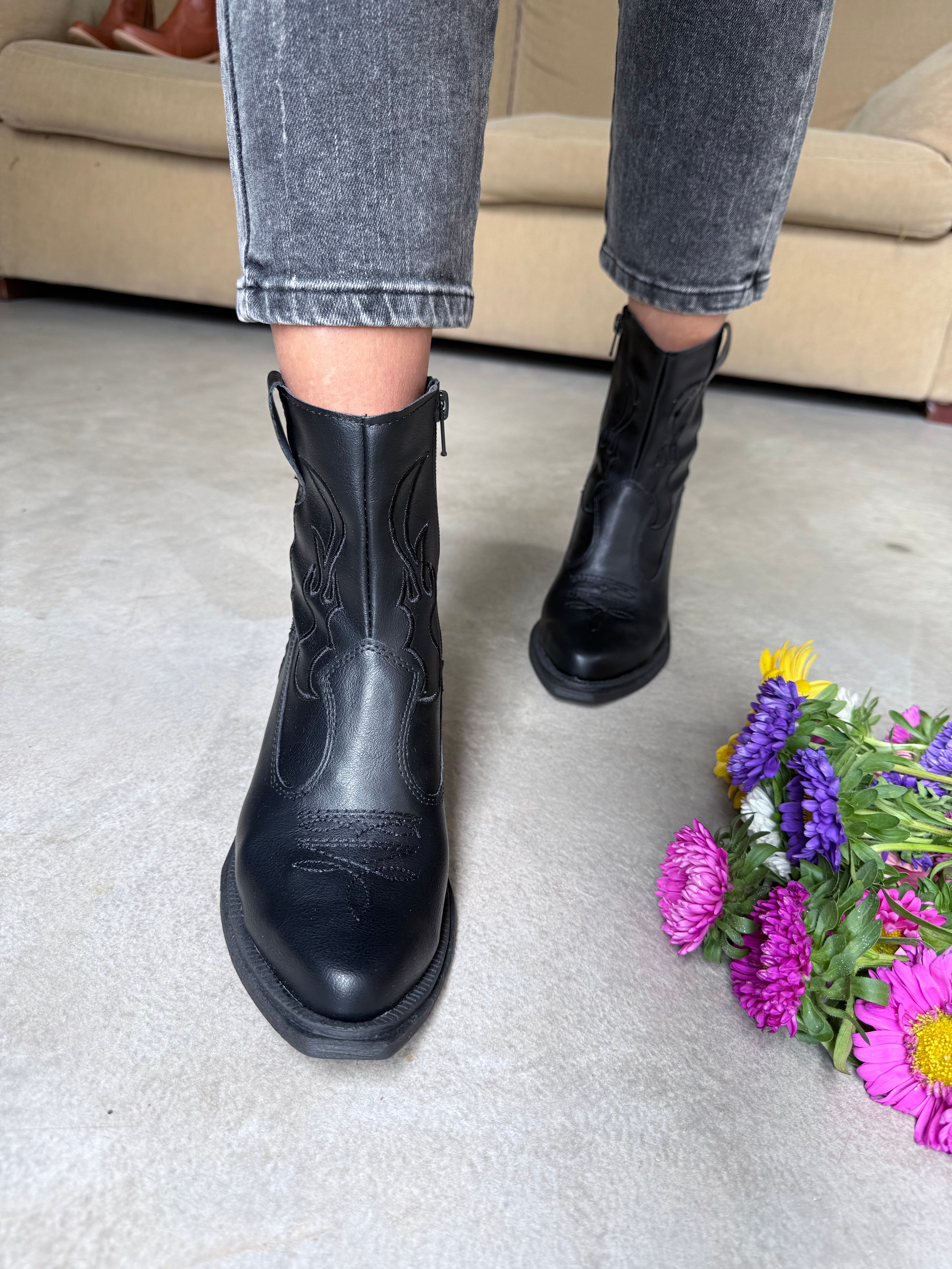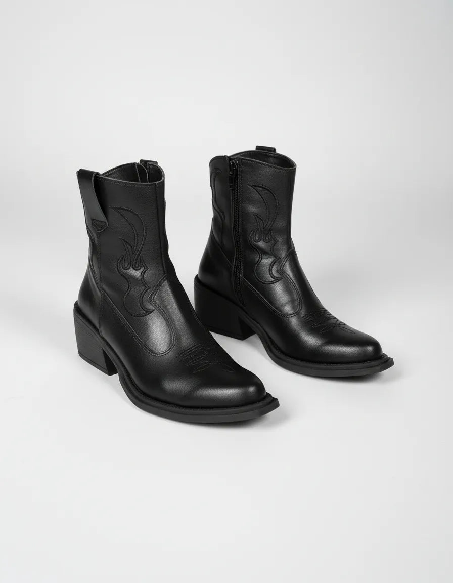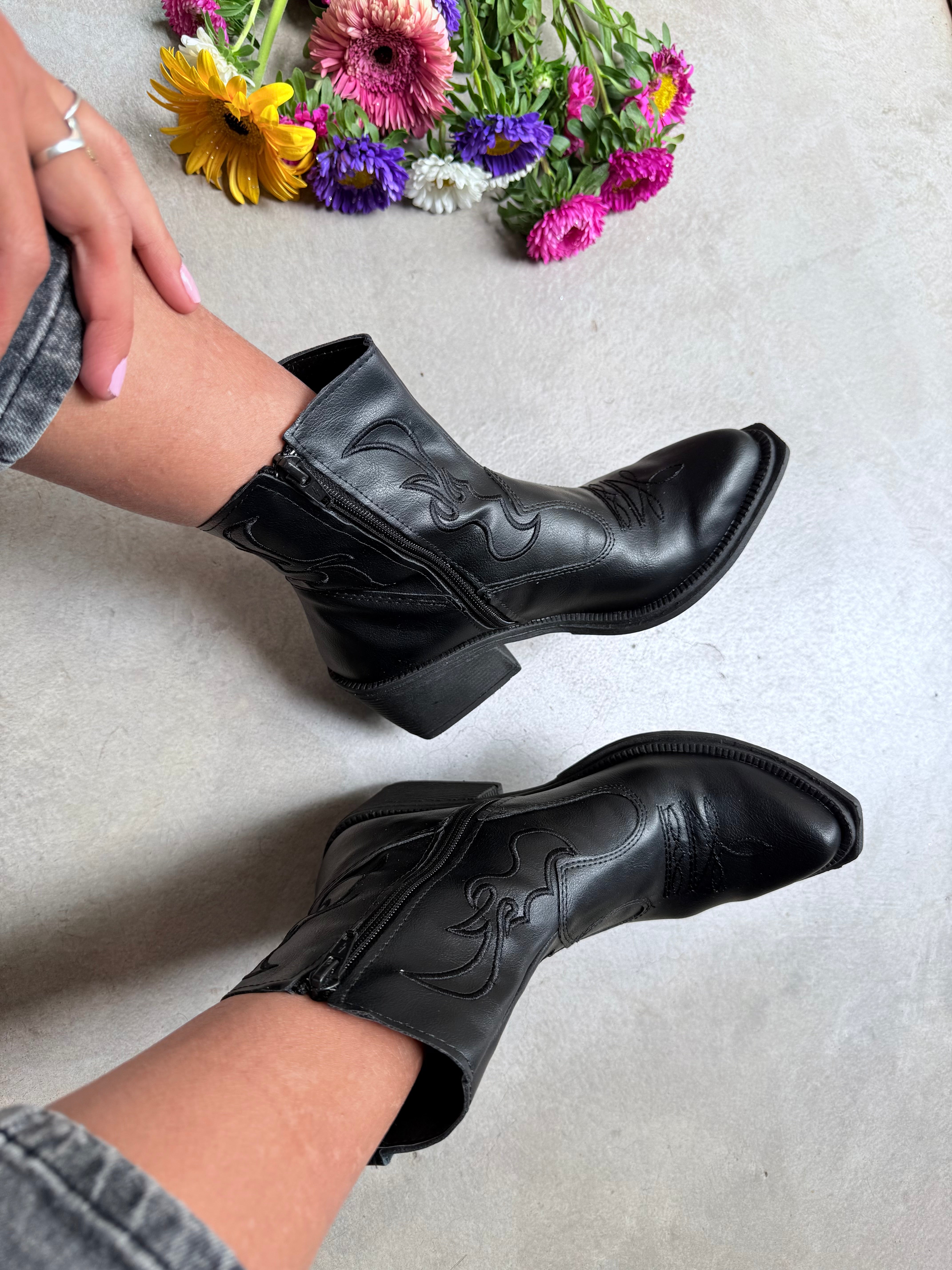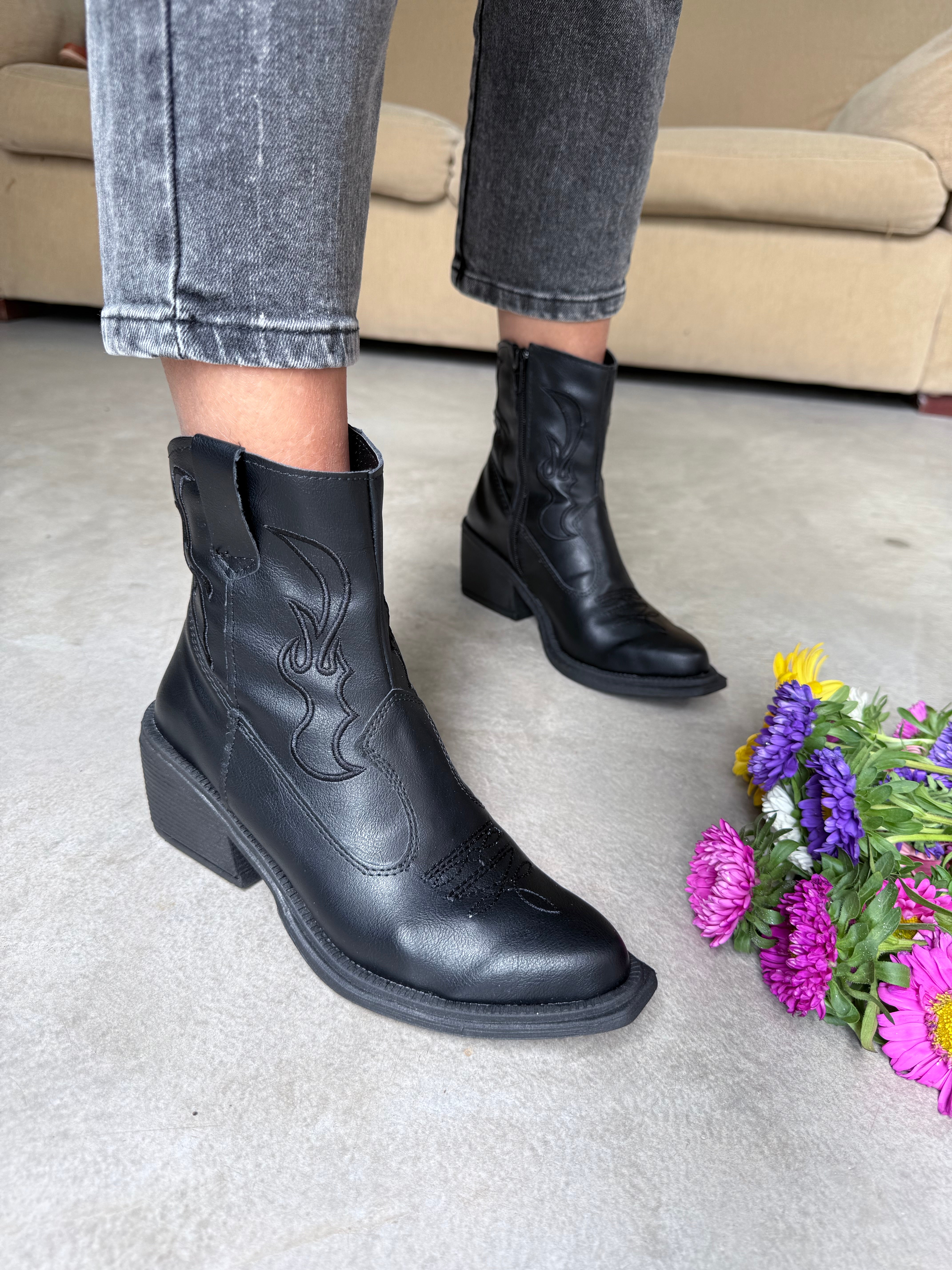 BOTAS TEXANAS MYRA NEGRO BORDADA PUNTA FINA CIERRE LATERAL NEGRO