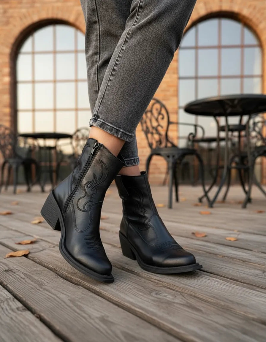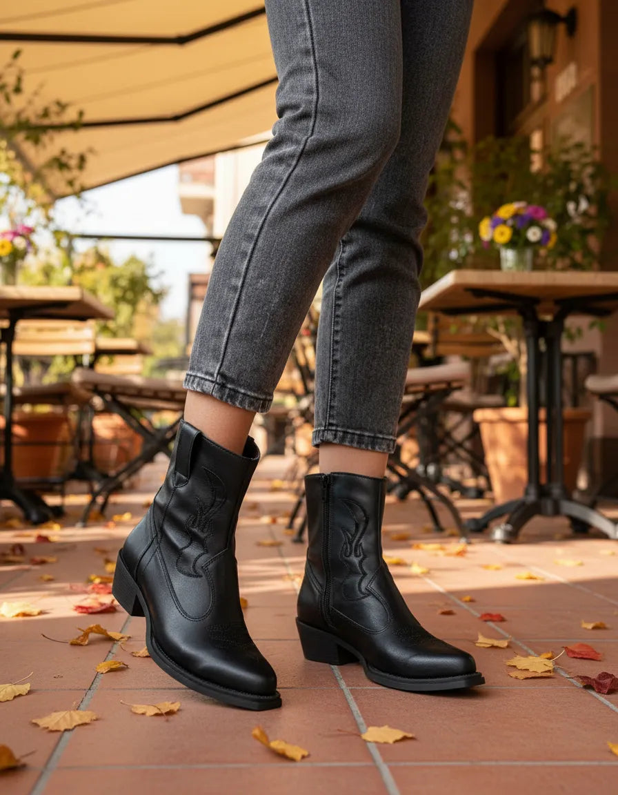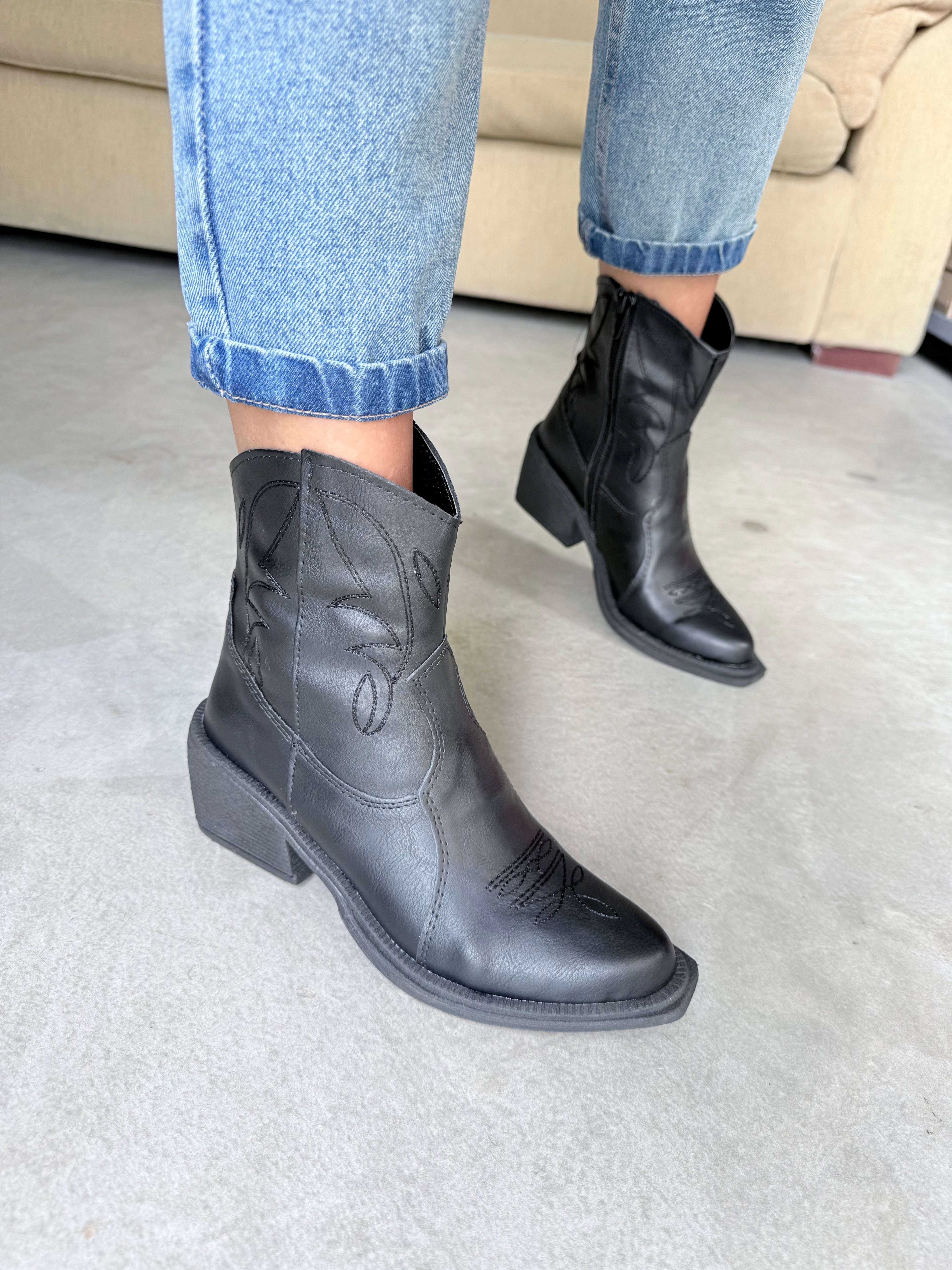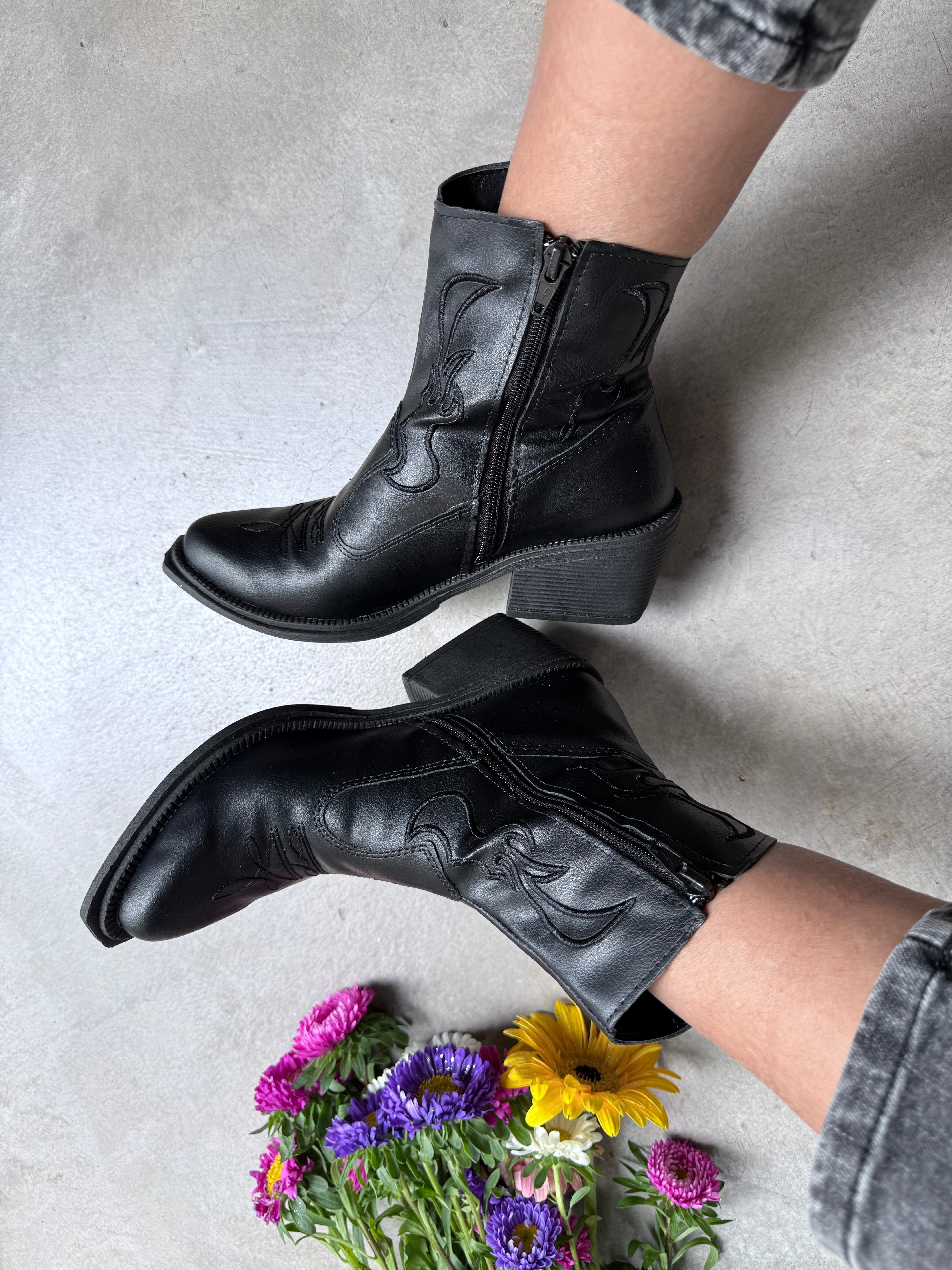 BOTAS TEXANAS MYRA NEGRO BORDADA PUNTA FINA CIERRE LATERAL NEGRO