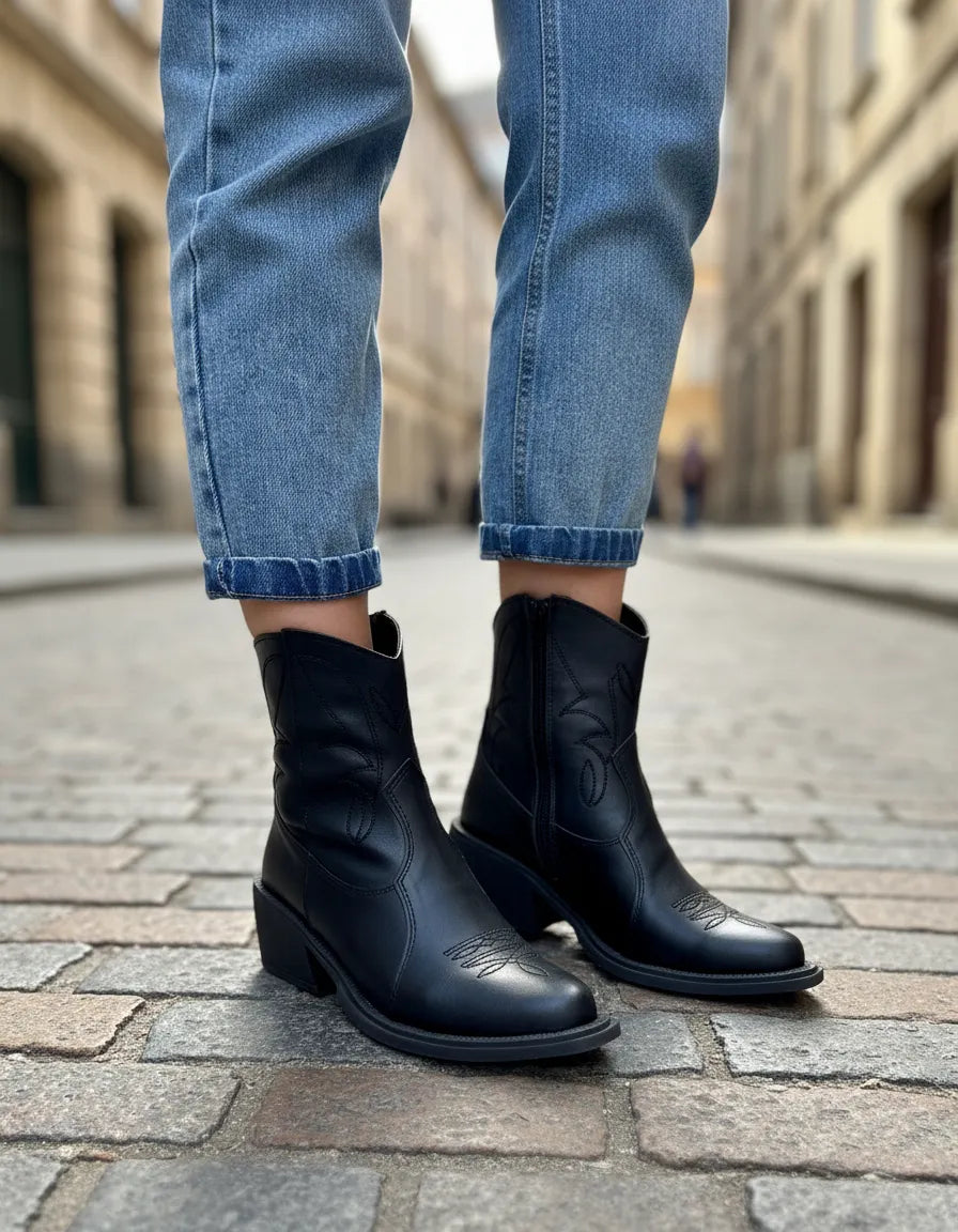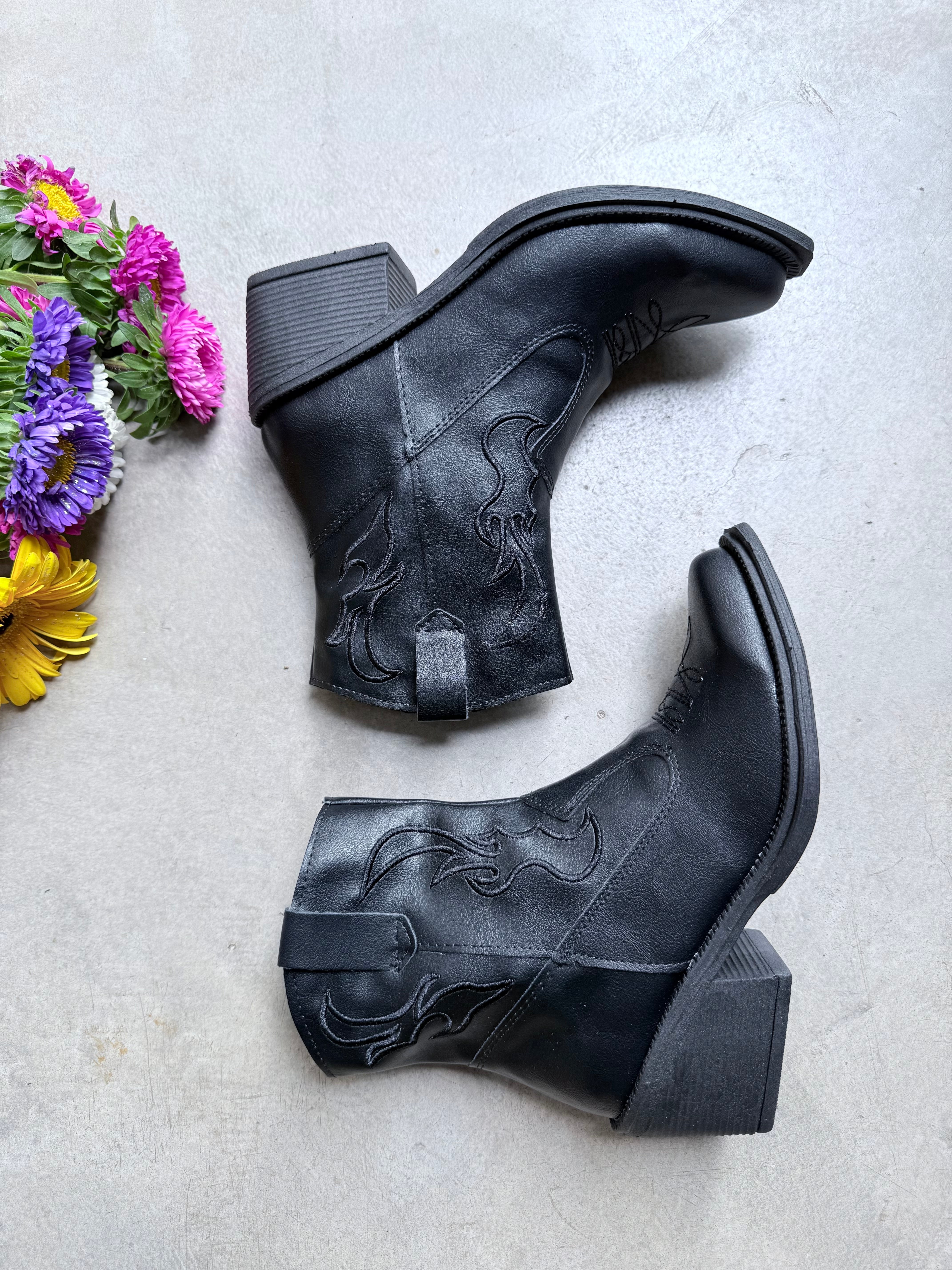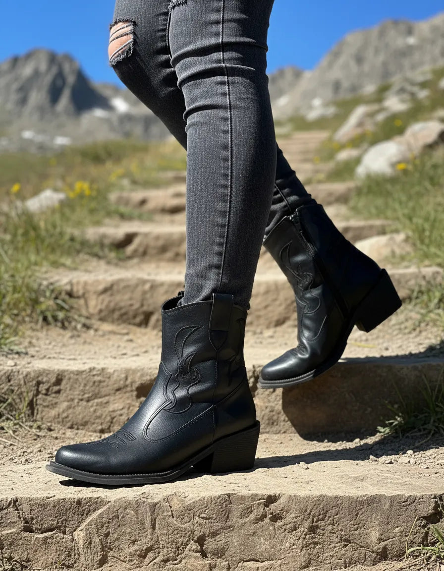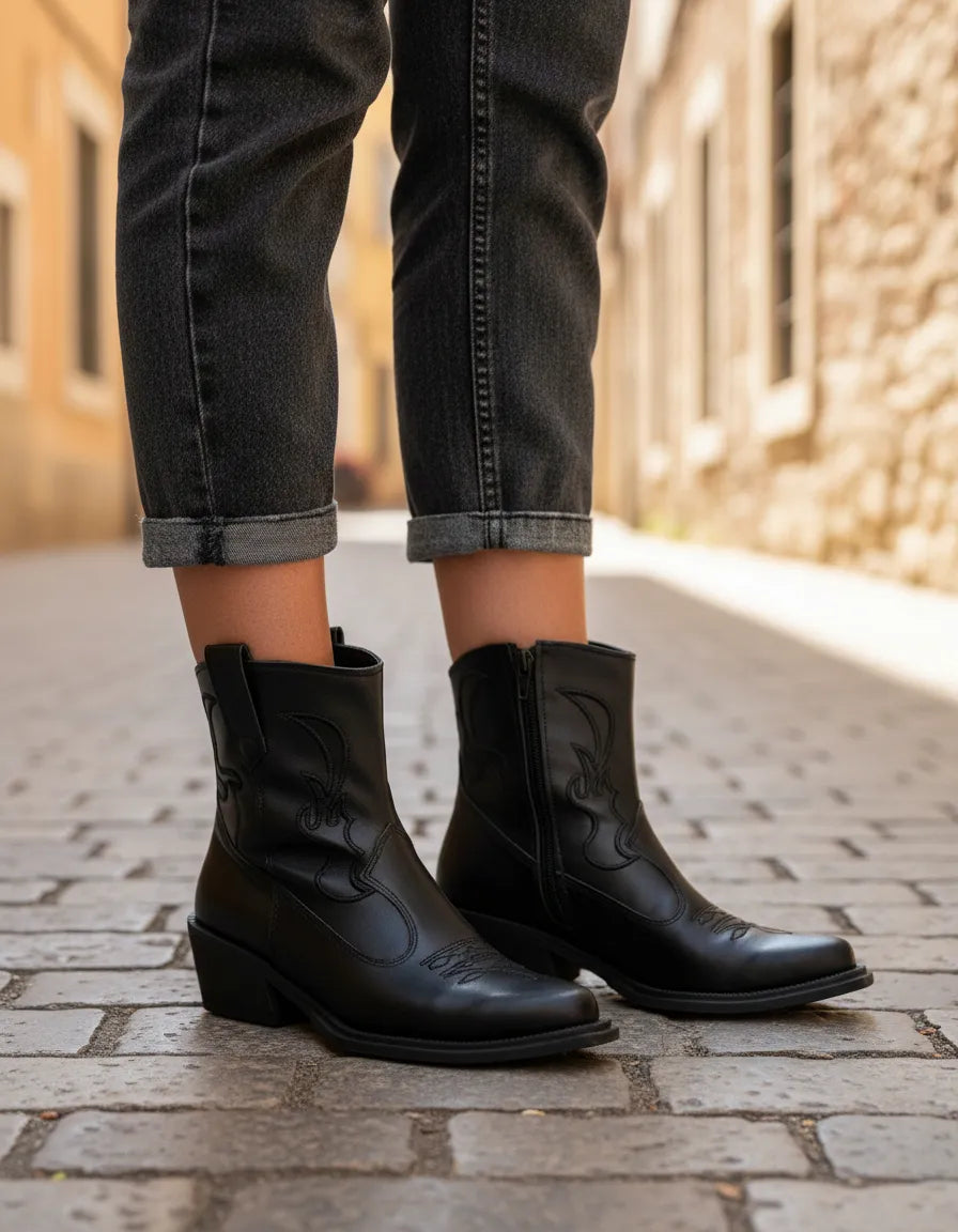 BOTAS TEXANAS MYRA NEGRO BORDADA PUNTA FINA CIERRE LATERAL NEGRO