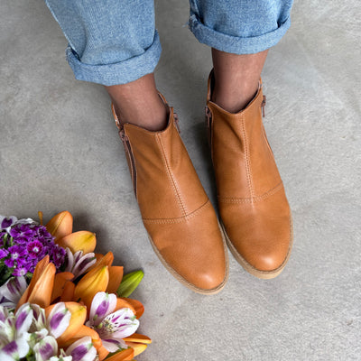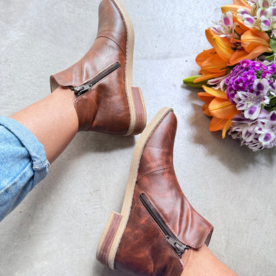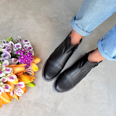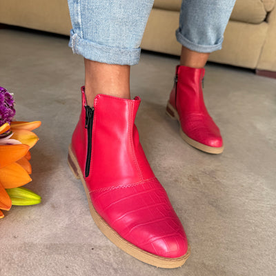 Confeccionada en cuero ecológico . Se accede con dos cierres laterales que facilita el calce del mismo. La punta está hecha de material símil cuero, que estiliza un diseño muy atractivo. interior se encuentra forrado en tela y la suela es de goma, antideslizante.