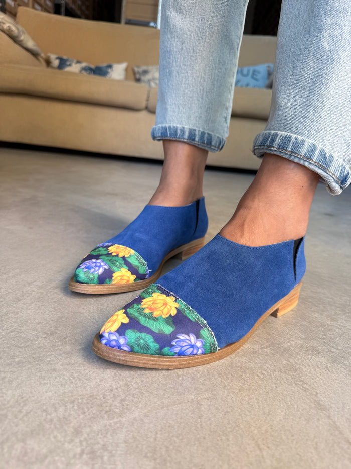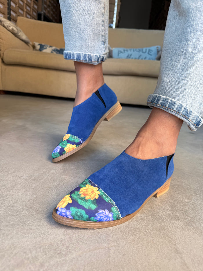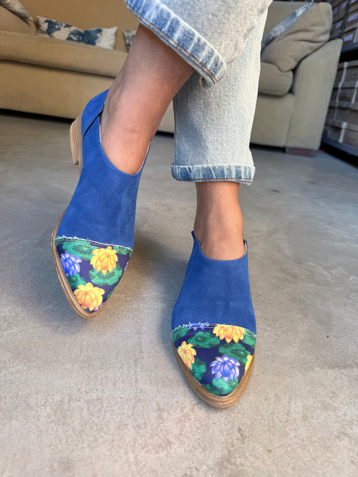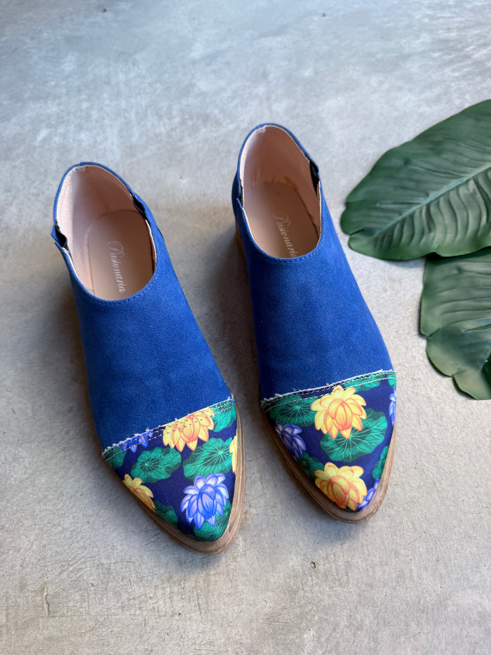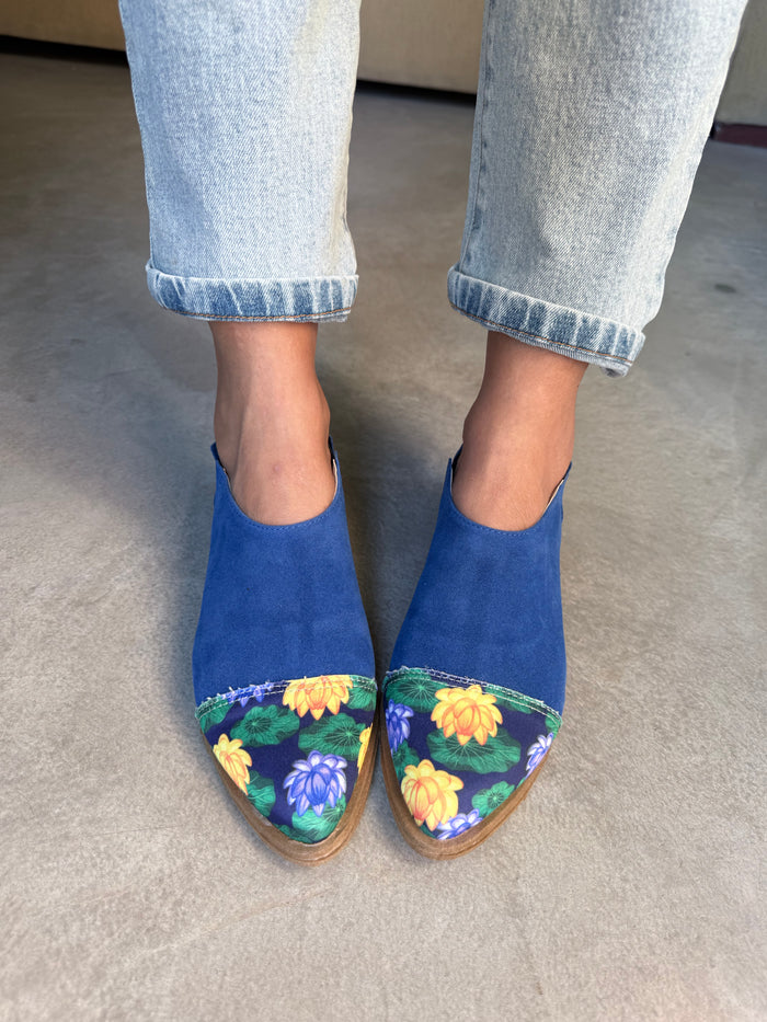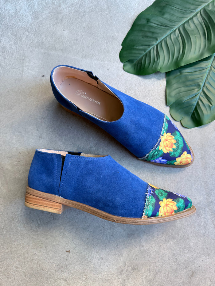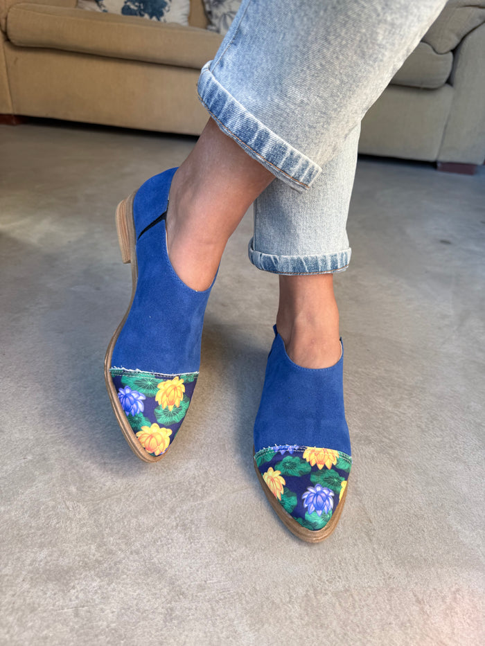 ANITA INFORMACIÓN DEL PRODUCTO: - Color: Azul punta estampado loto azul- Material: Gamuza con ecocuero - Altura del Taco: 2 cm.