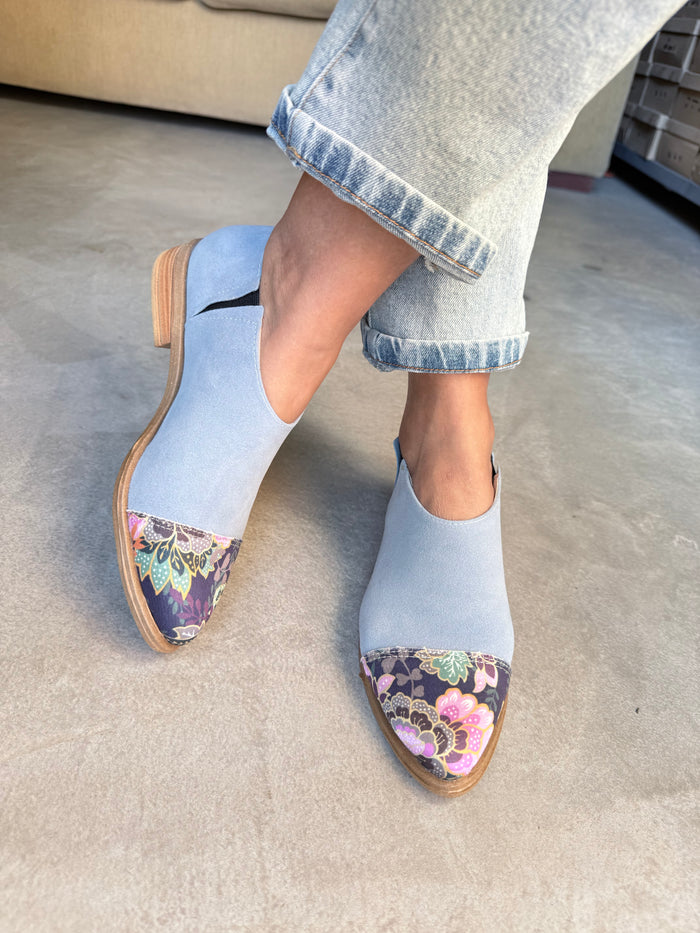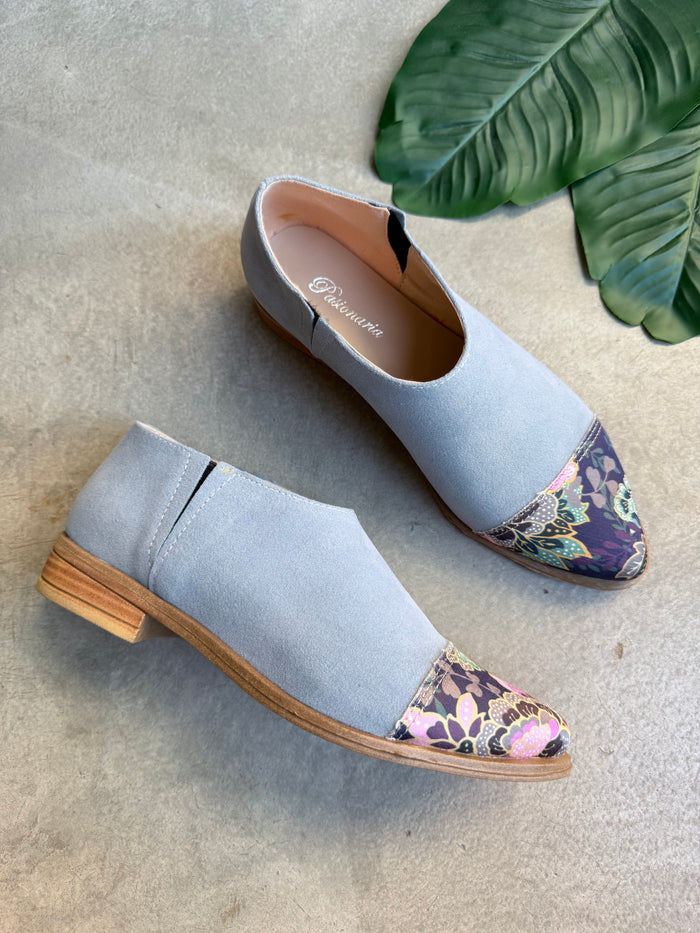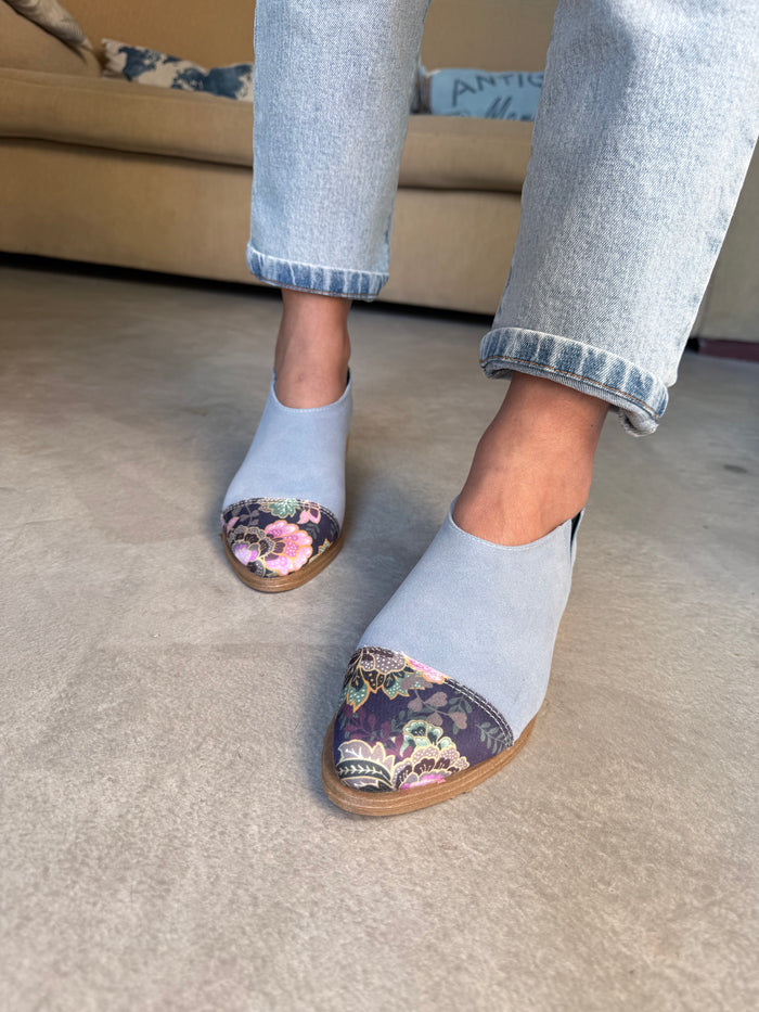 ANITA INFORMACIÓN DEL PRODUCTO: - Color: Lavanda, celeste punta estampado hawai- Material: Gamuza con ecocuero - Altura del Taco: 2 cm.