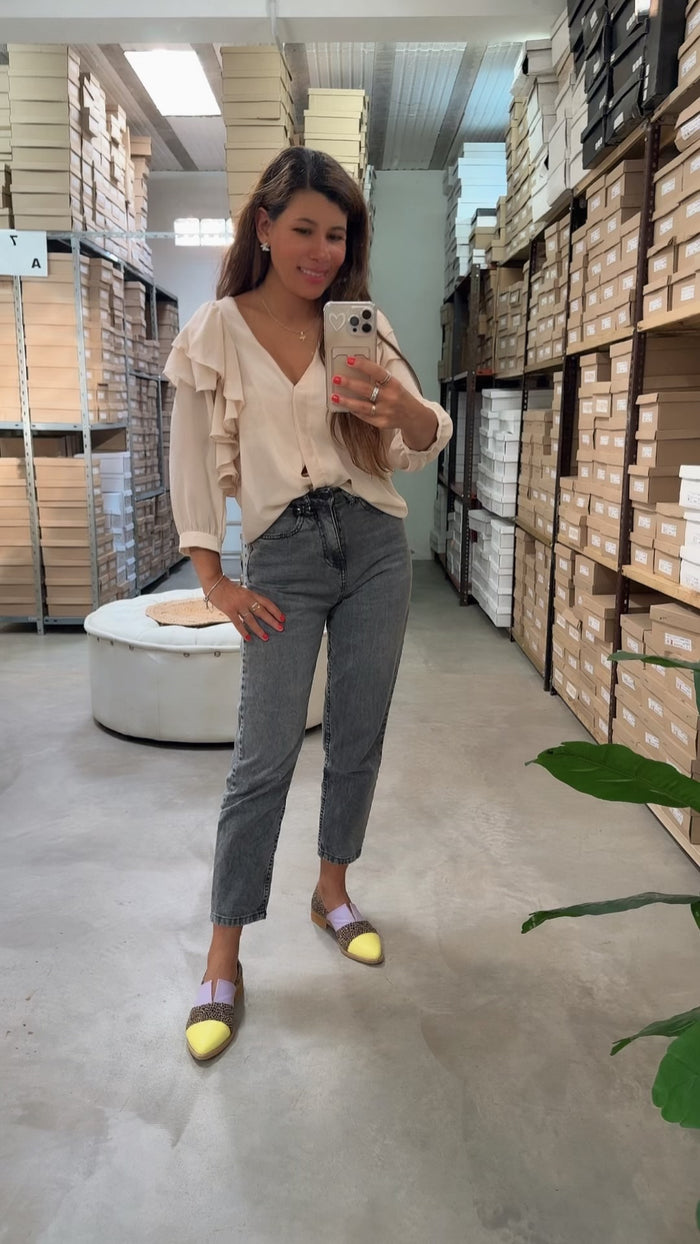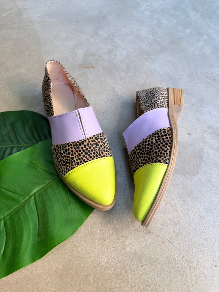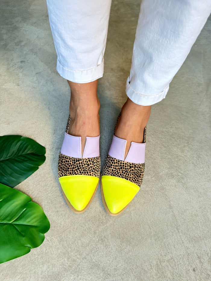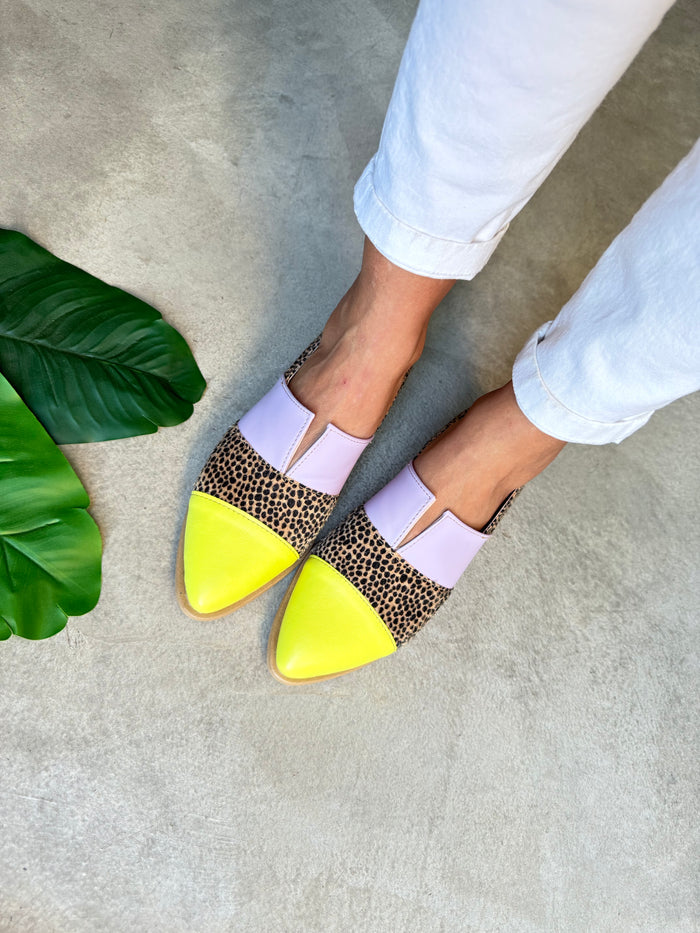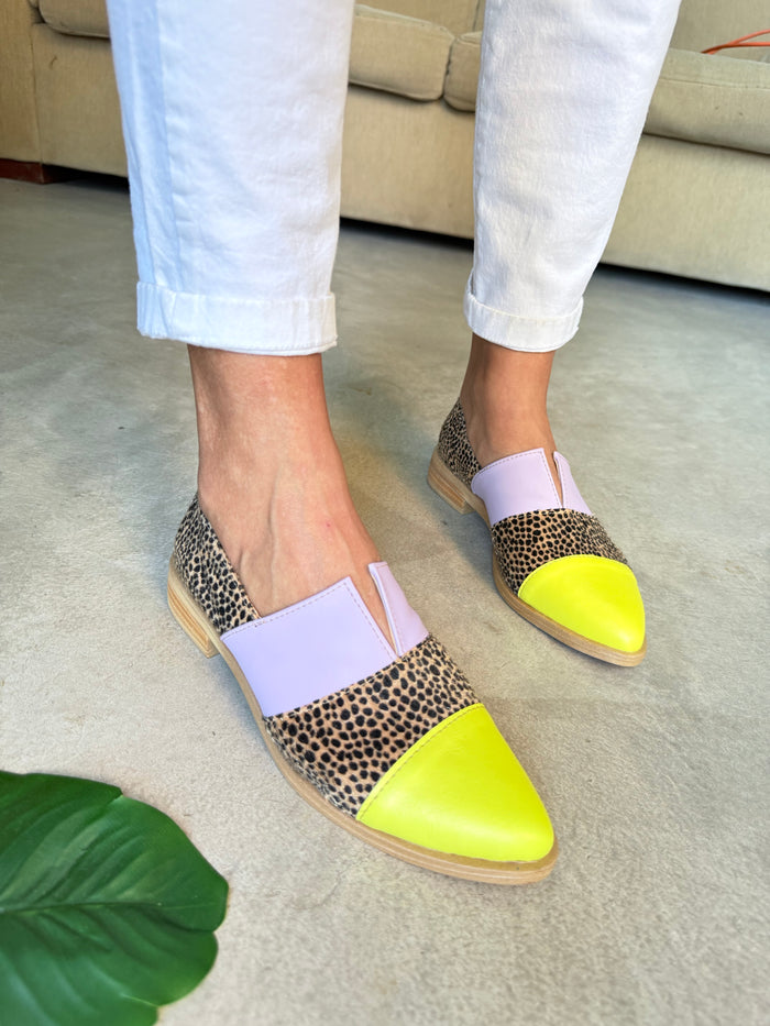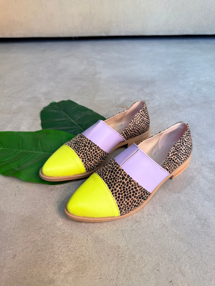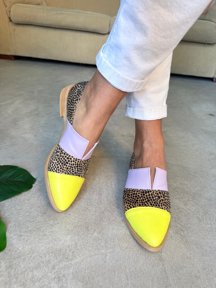CHINITA (Art. CAM) CÁPSULA MBURUCUYÁ - SOLO 26 PARES. ÚNICOS E IRREPETIBLES INFORMACIÓN DEL PRODUCTO: Color: CHITA PELO COMBINADO CON ECOCUERO LILA Y AMARILLO LIMA Material: Símil Cuero Altura del Taco:...