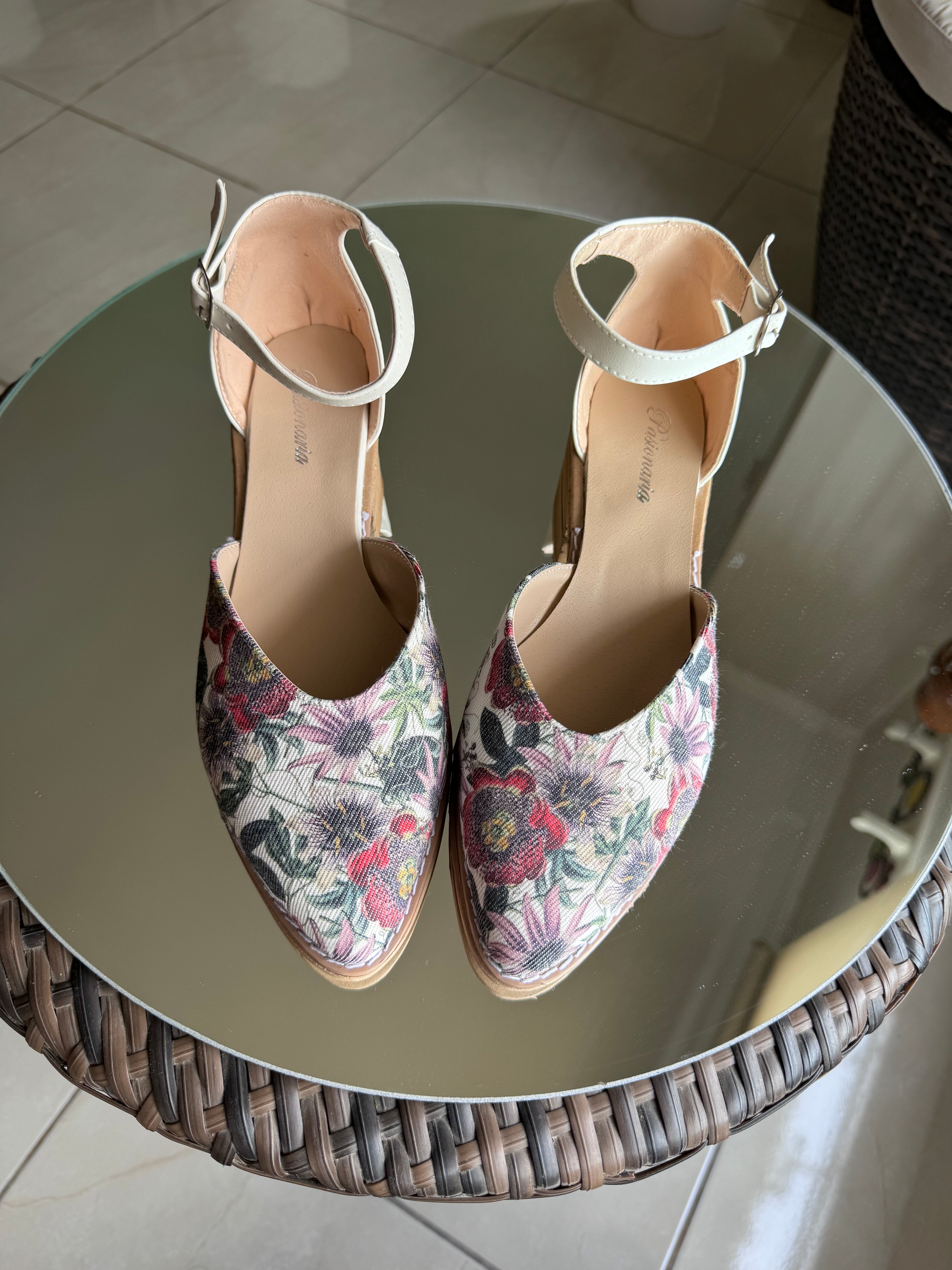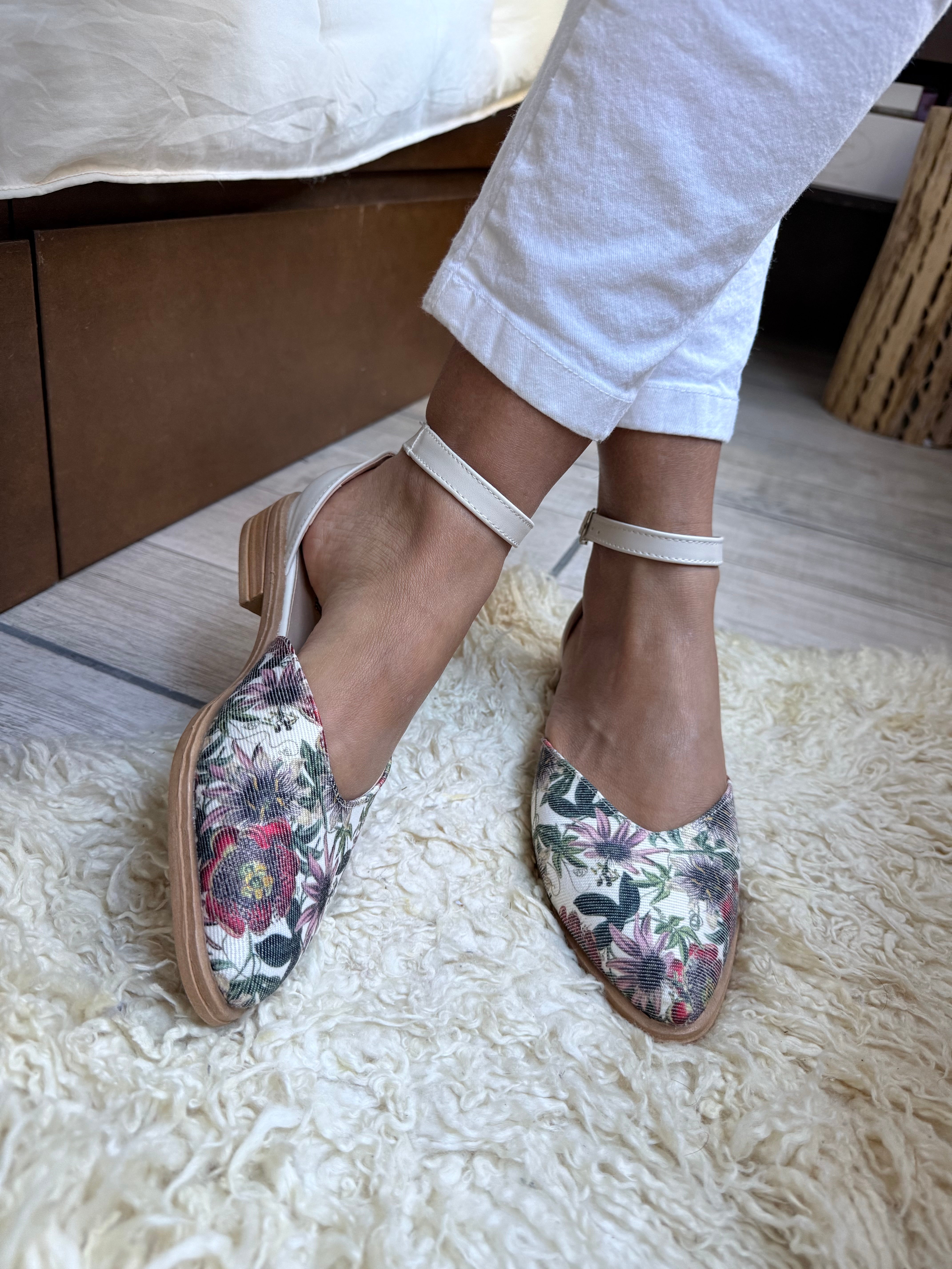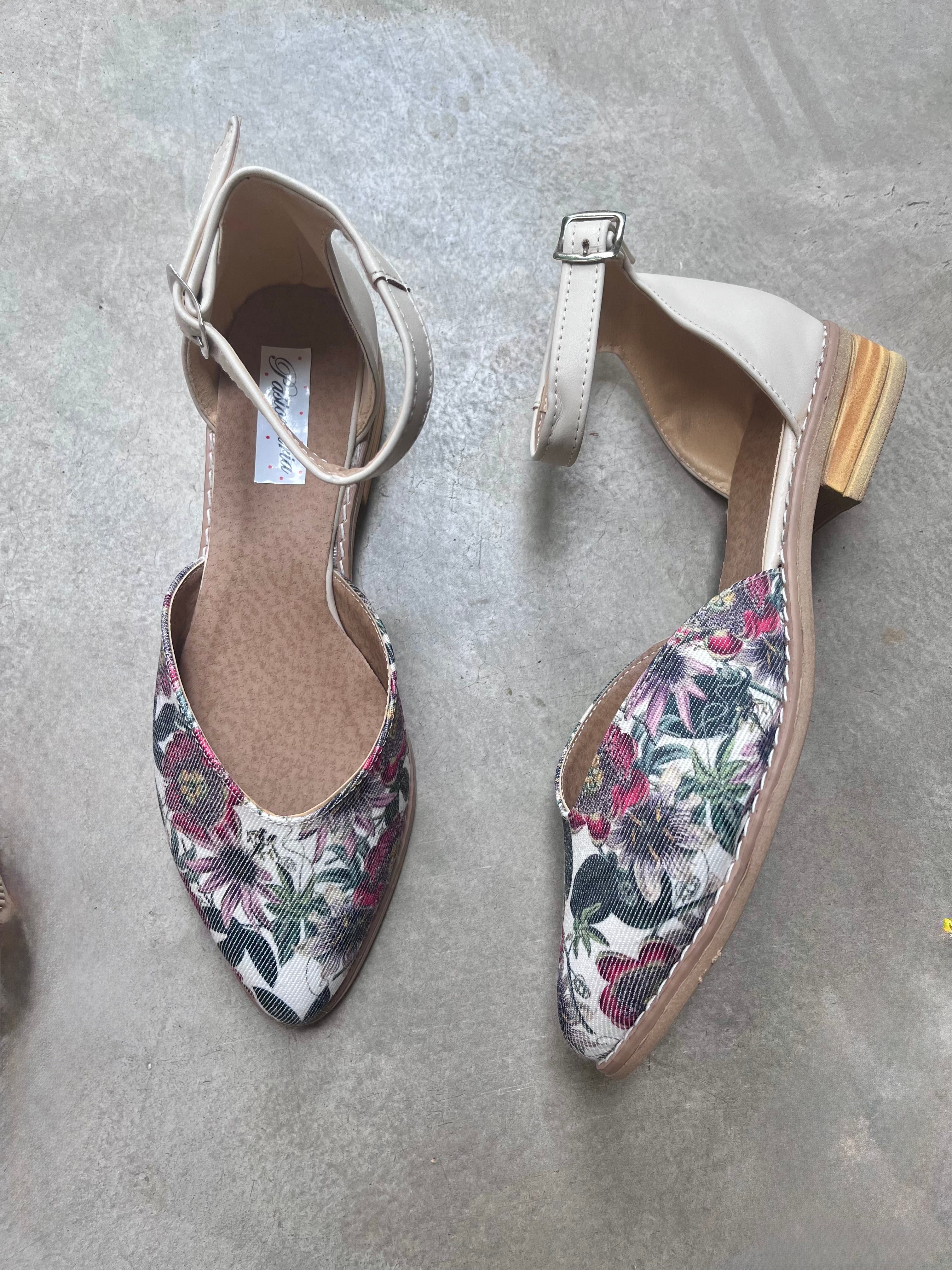 NINITA (Art. 310) INFORMACIÓN DEL PRODUCTO: - Color: Tela estampado PASIONARIAS combinado con hueso o blanco ecocuero - Diseño: corte corazón   - Material: tela simil gabardina estampada PASIONARIAS en la...