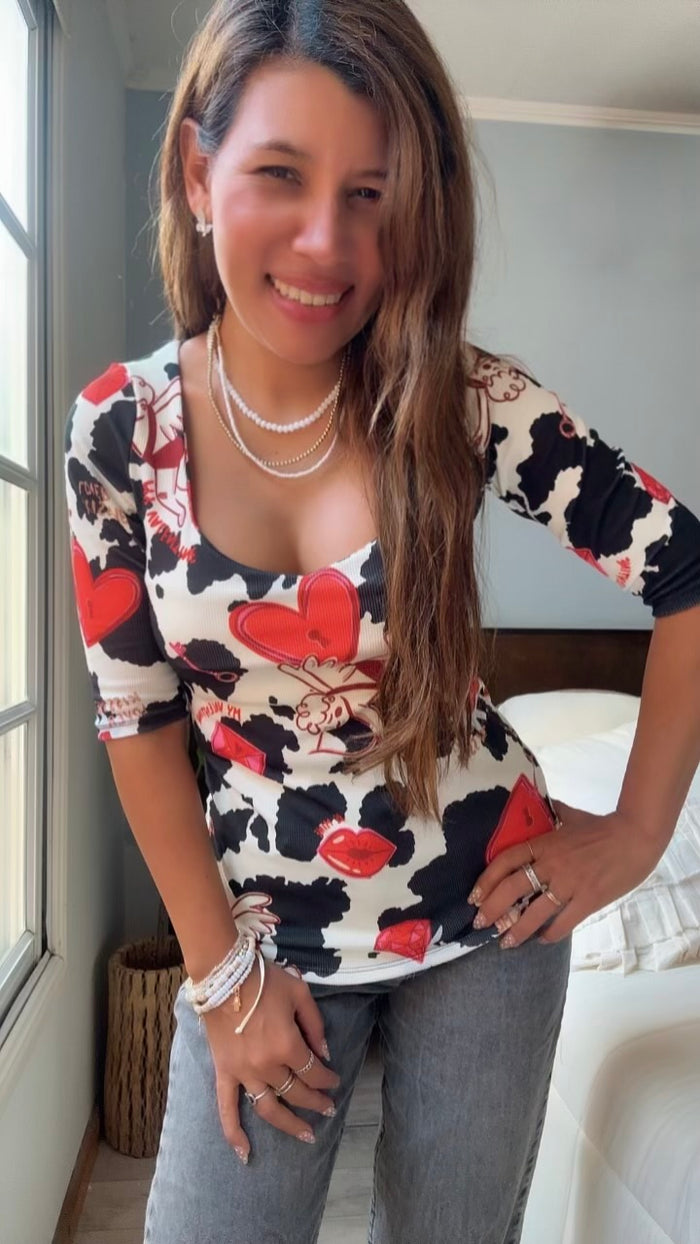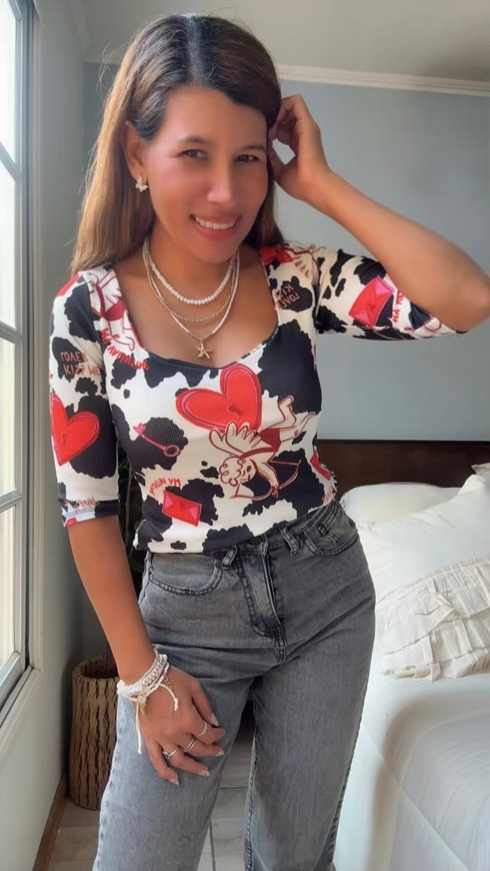 Mod. TIGRESA Color: fondo blanco, estampado ROJO, NEGRO Material: Morley ATENCIÓN: Corroborar medidas TALLE ÚNICO  ANCHO: 36 cm  LARGO: 60 cm  MANGA LARGO: 33 cm
