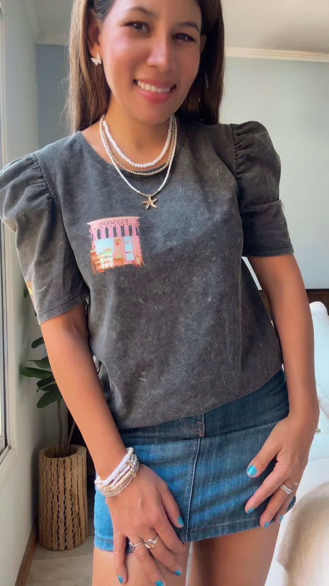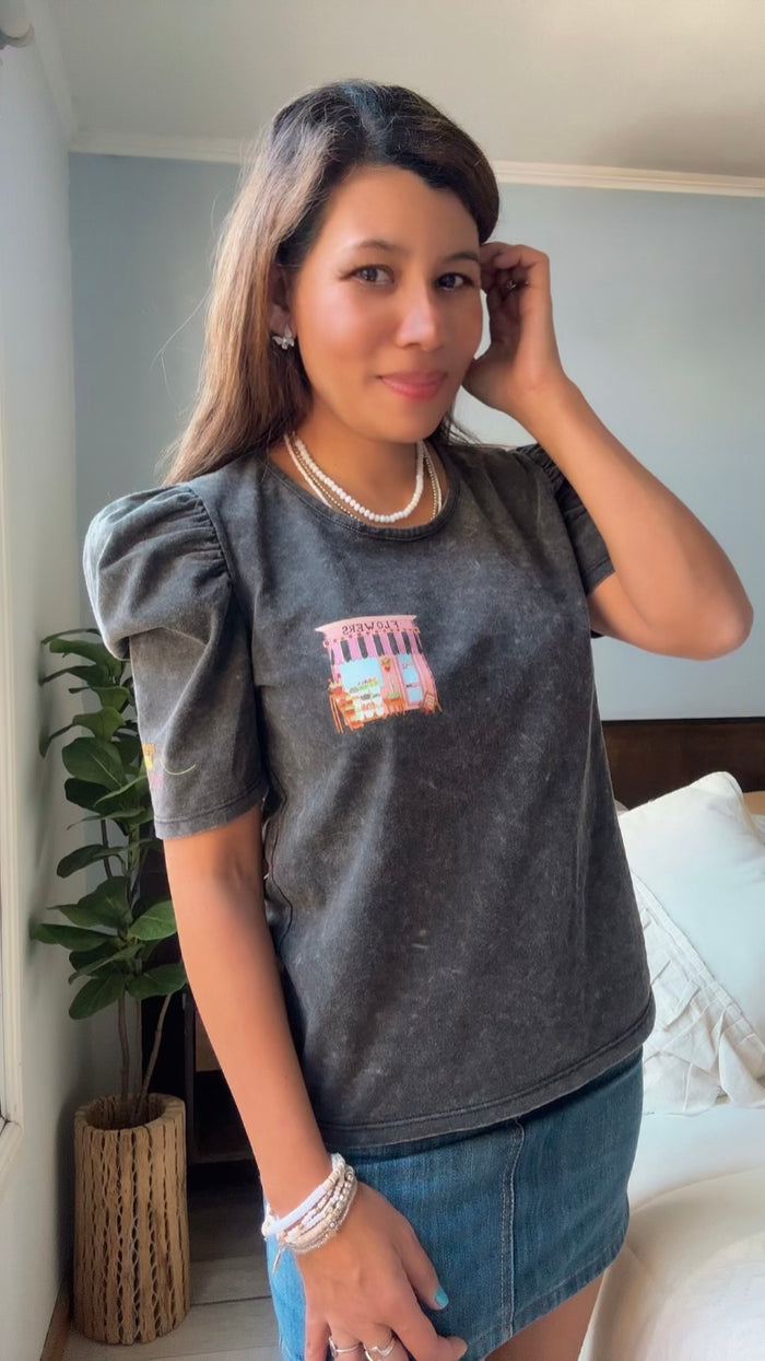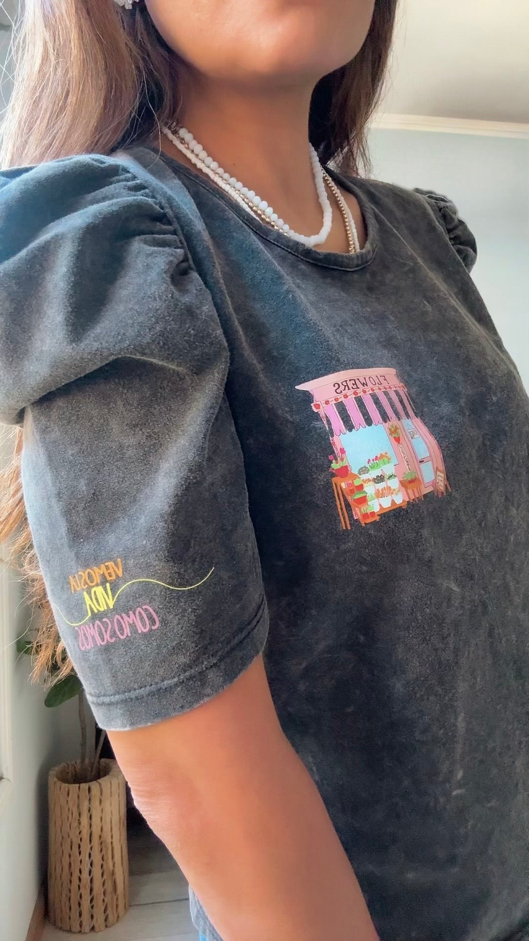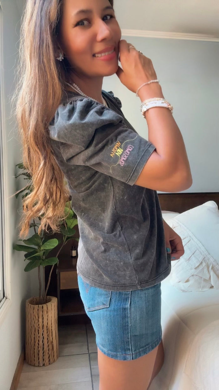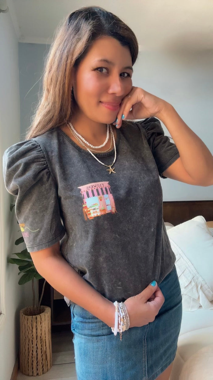 Mod. GUARANÁ FLORERIA Talle Único (Cede hasta un talle M)  Ancho: 49 cm. Largo: 54 cm Color: NEVADO gris Material: Algodón Mangas: Cortas Estampa DTF frente y manga Detalle: Frase en...
