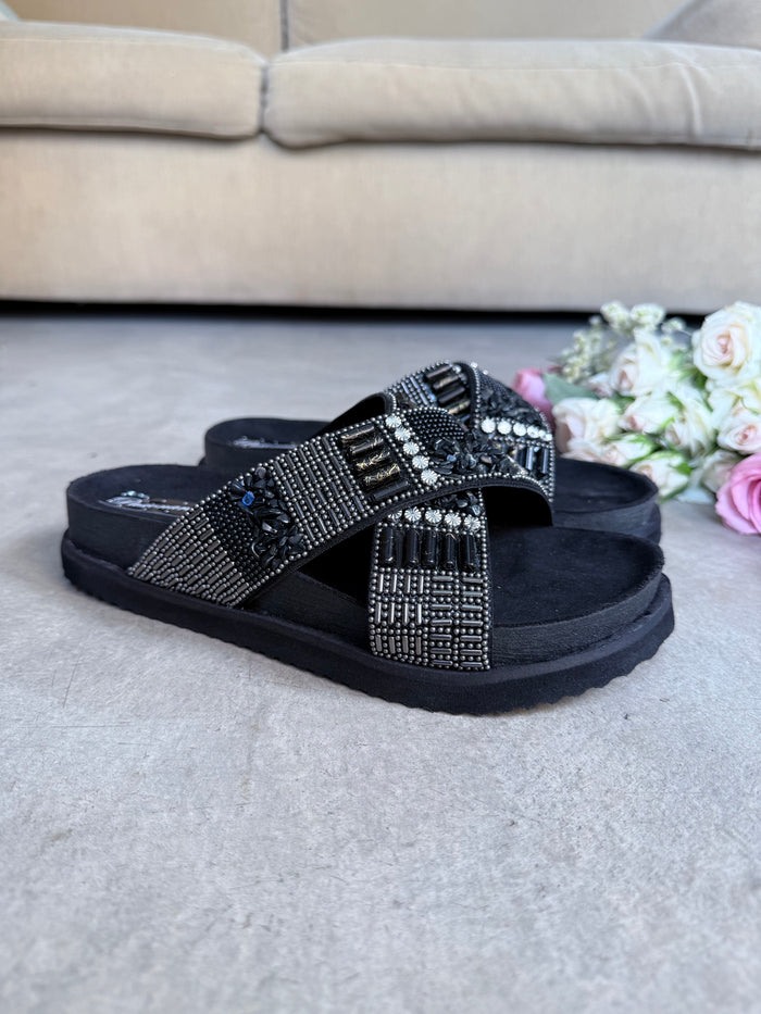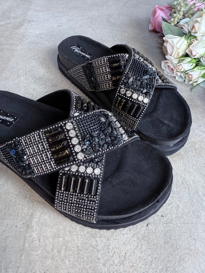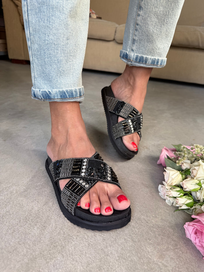 FREYA (Art.Luxor) INFORMACIÓN DEL PRODUCTO: - Color: Negro- Material: Cuero Ecológico con Canutillos Bordados - Plataforma: Altura Frente 2 cm | Altura atrás 3,5 cm - Talles del 35 al...