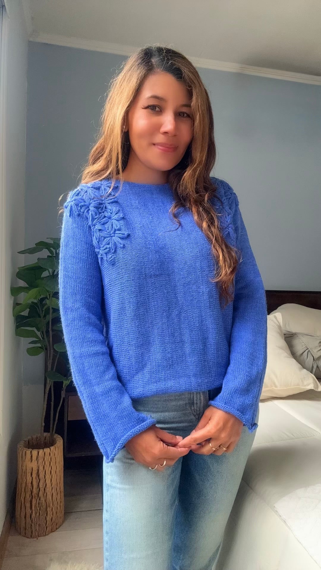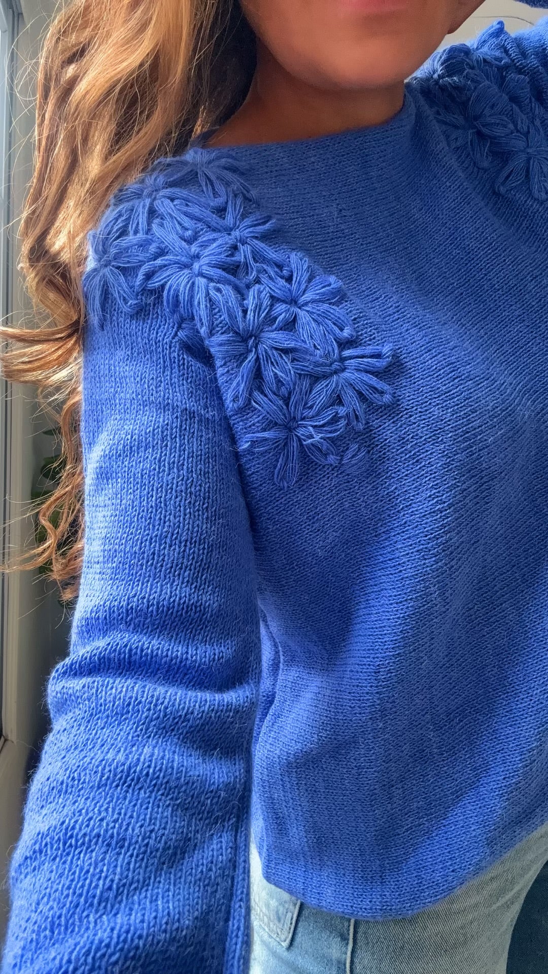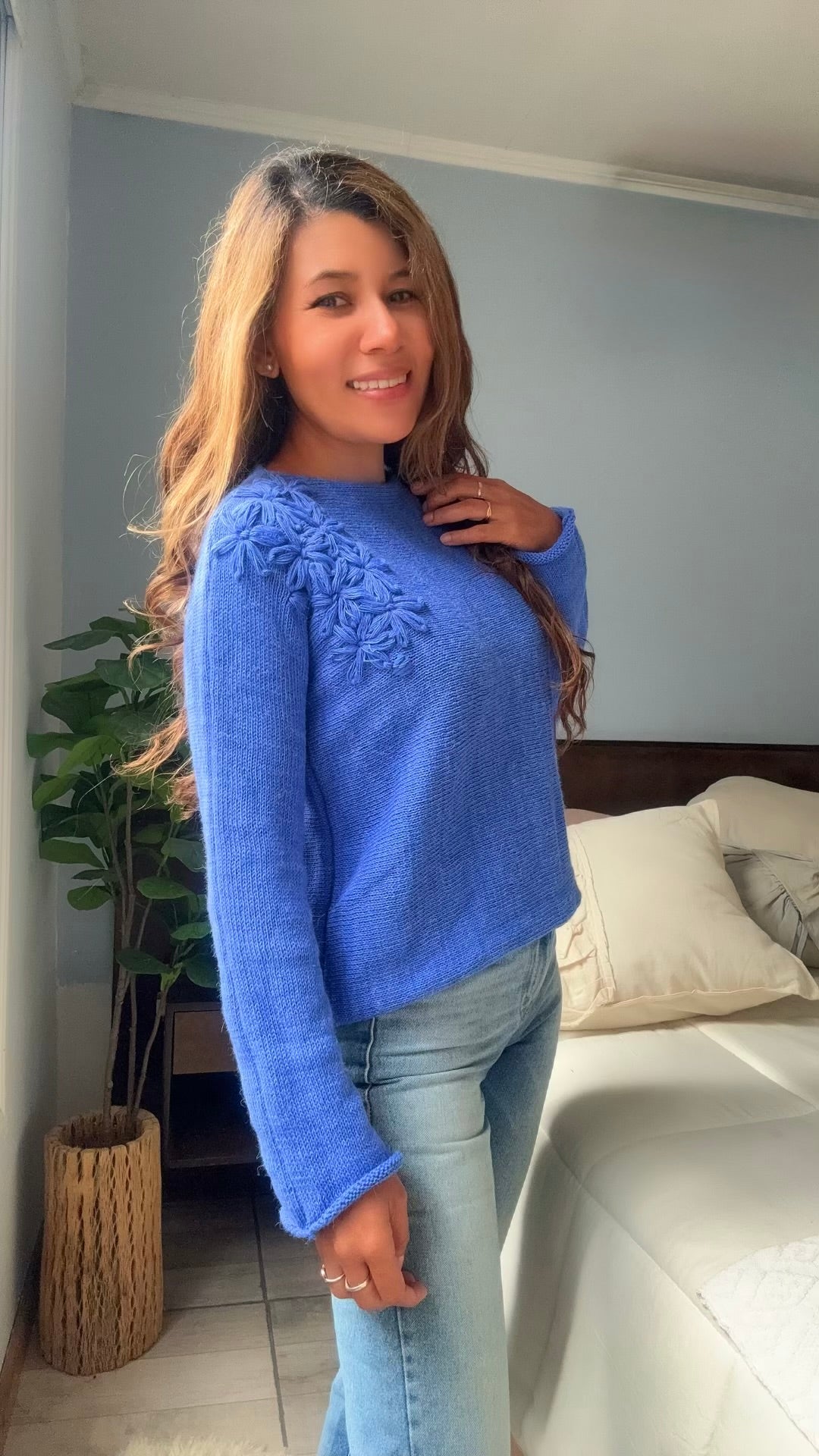 SWEATER JABUTICABA AZUL TEJIDO EN LANA MOHAIR con FLORES BORDADAS A MANO