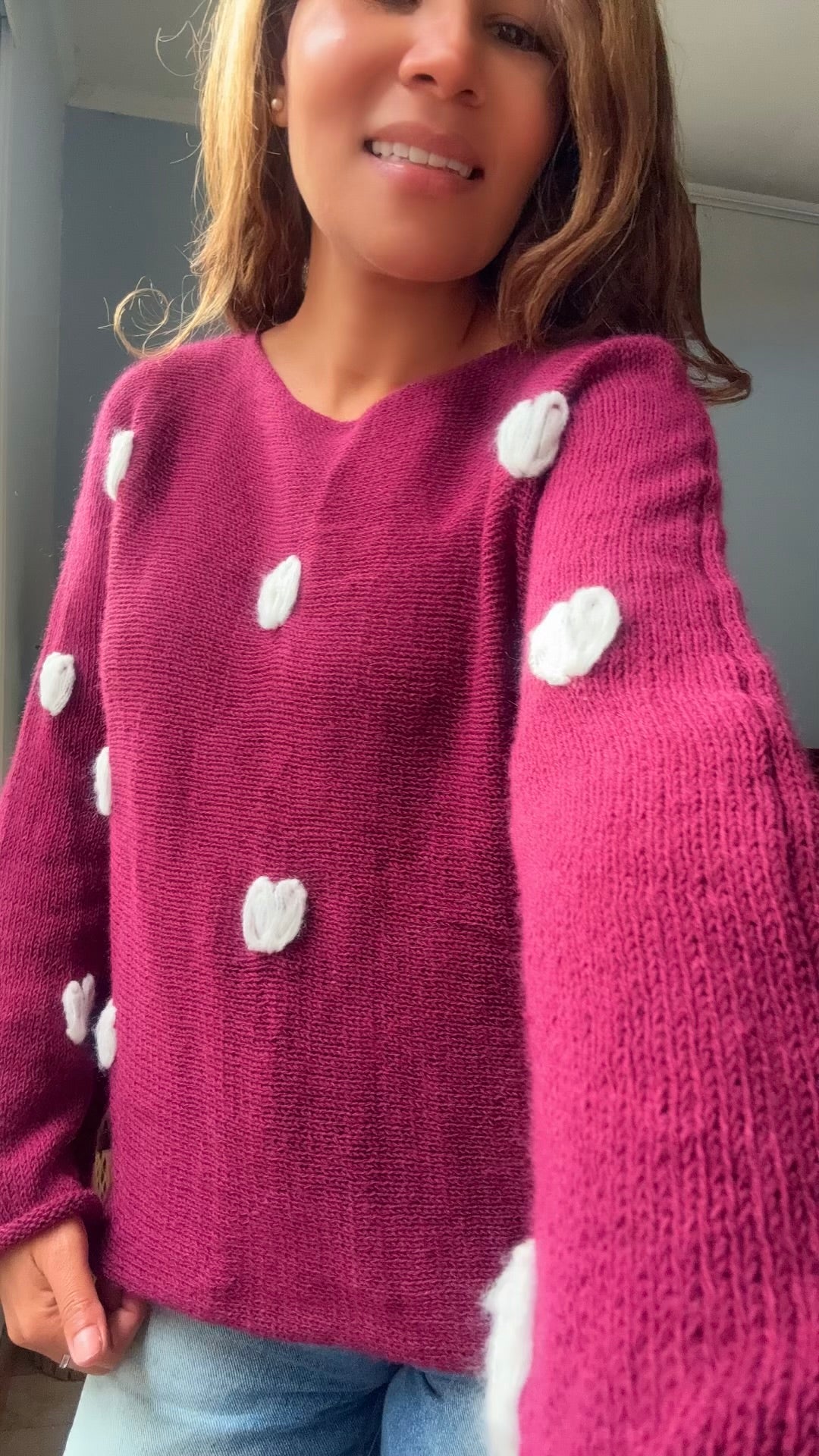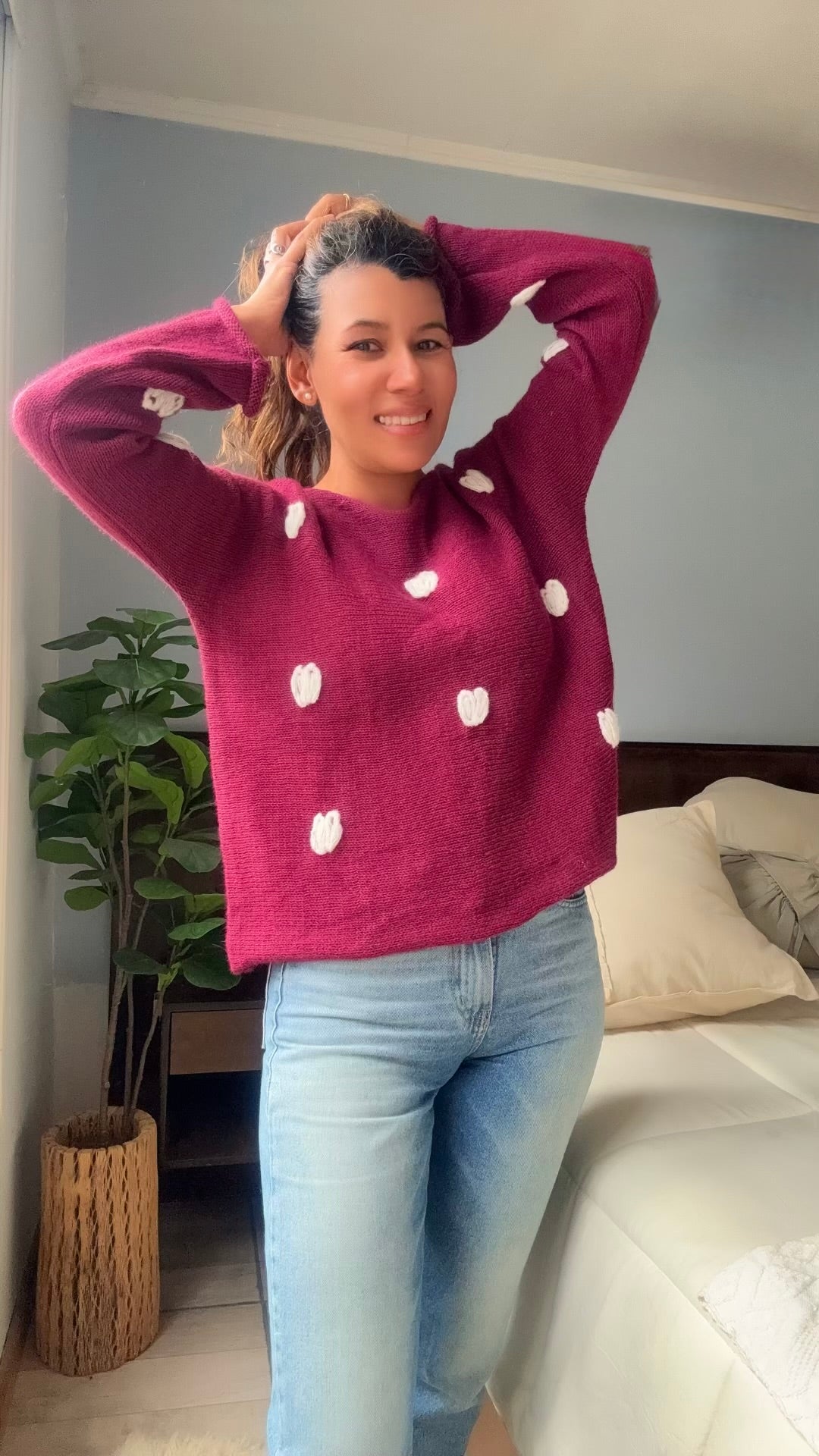 SWEATER TEJIDO CUORE VIOLETA EN LANA MOHAIR con CORAZONES BLANCOS BORDADO A MANOS