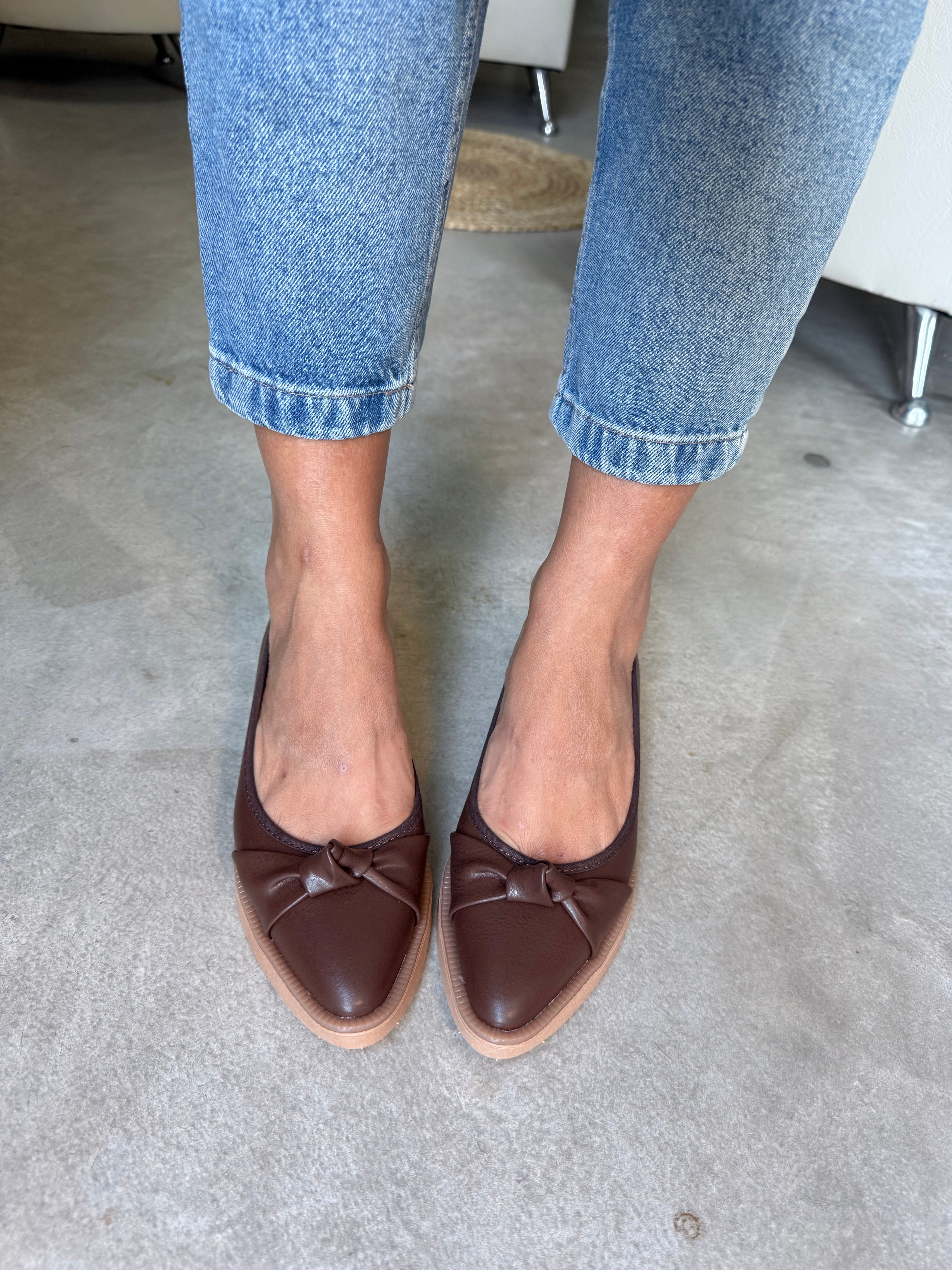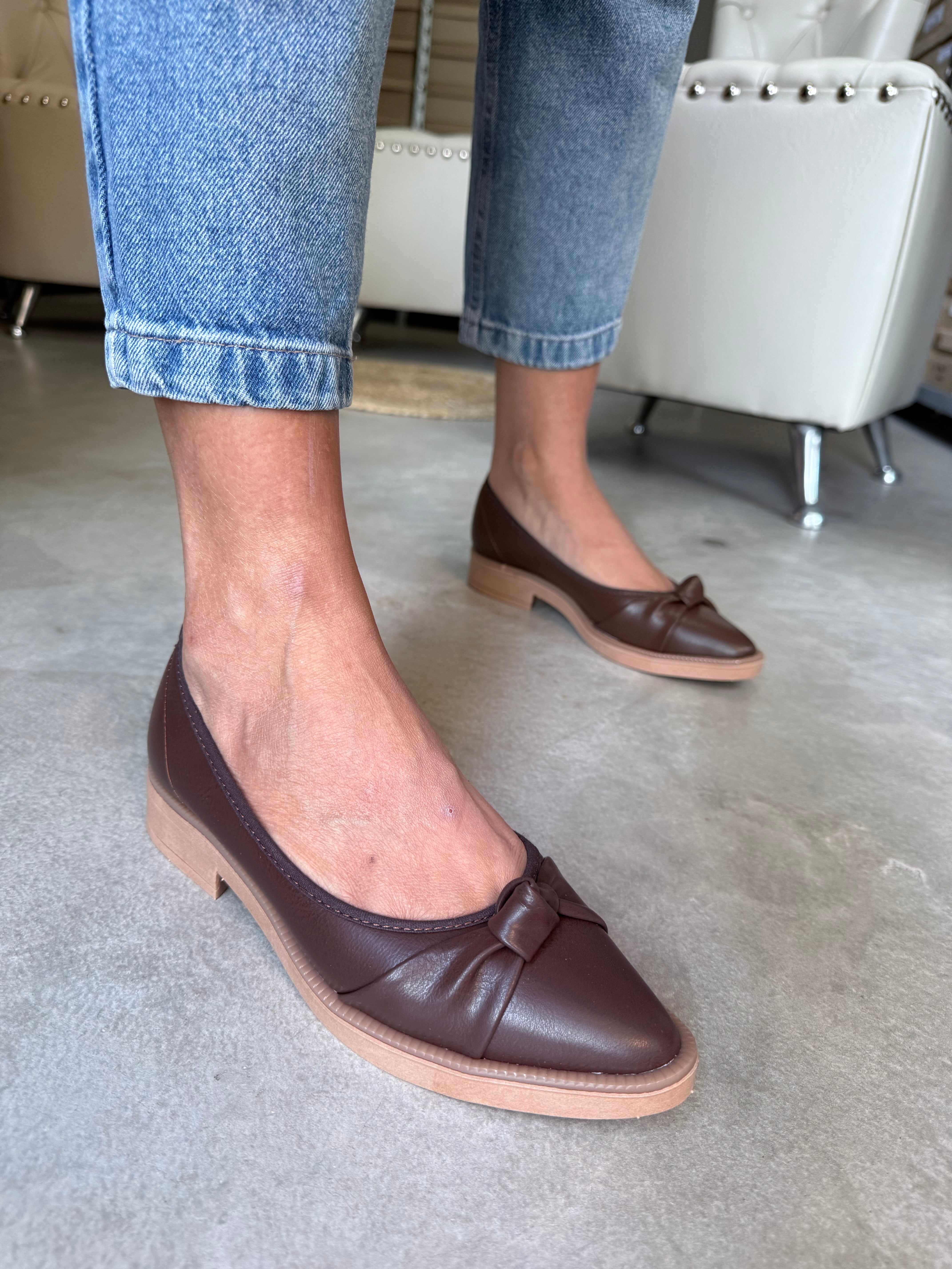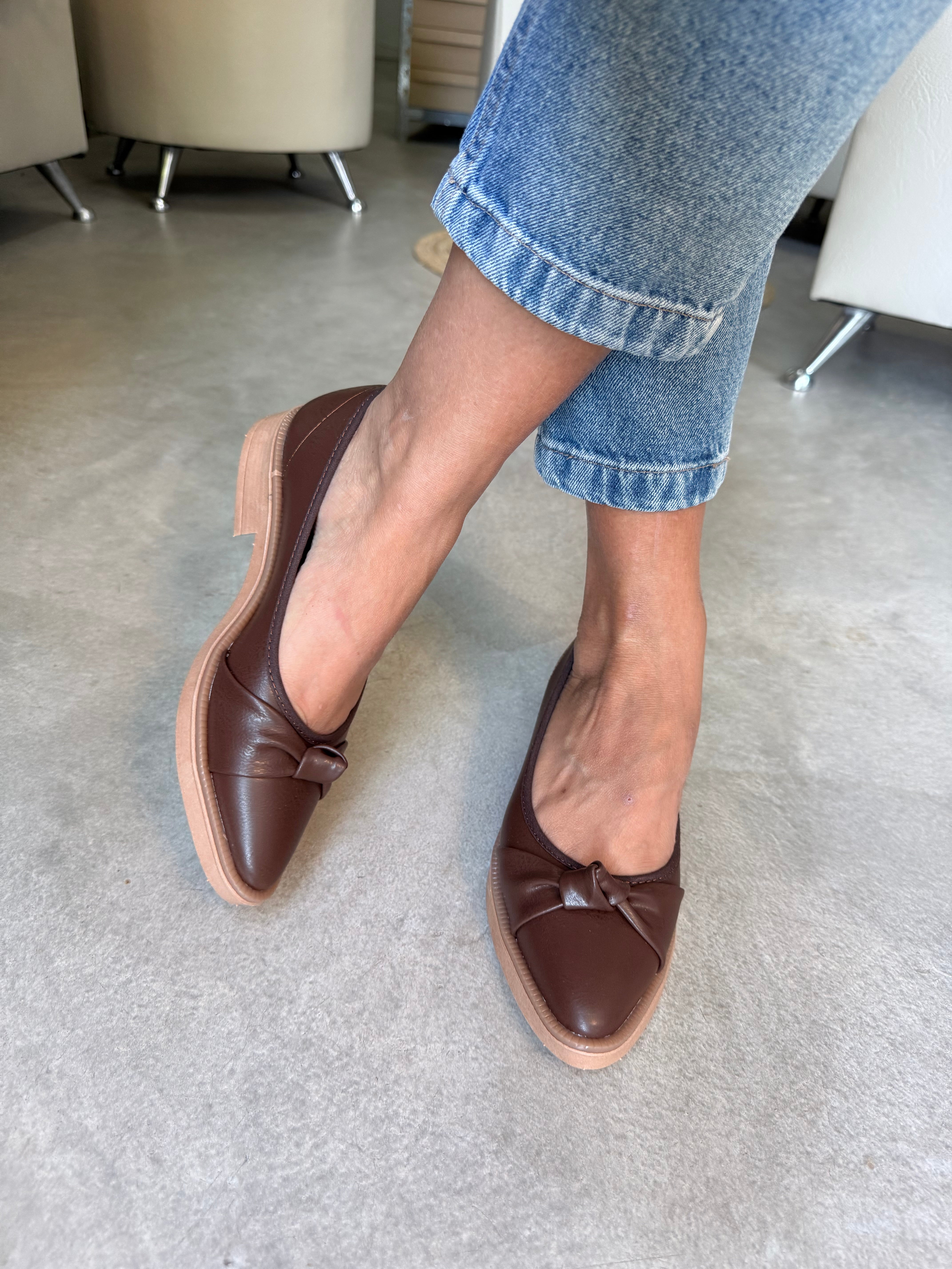 GALA- (Art. 759) INFORMACIÓN DEL PRODUCTO: Color: chocolate  nudo chocolate Material Cuero ecológico  Punta Fina Base de Goma Antideslizante TR Altura del Taco: 3 cm. Horma estándar