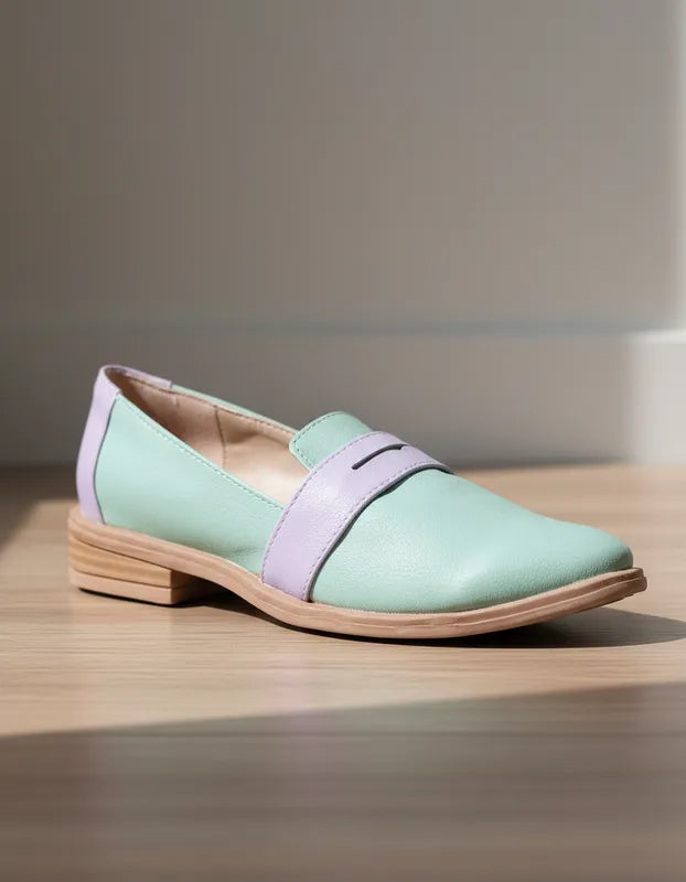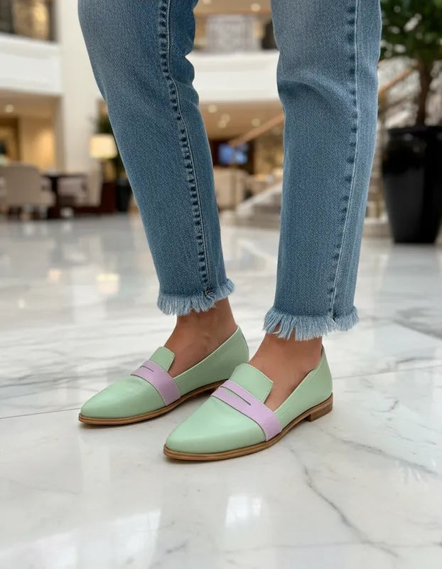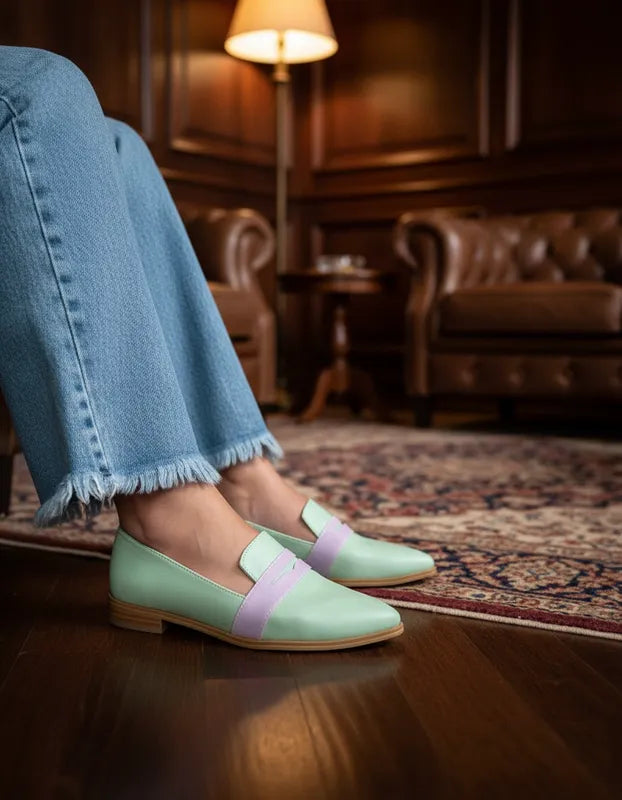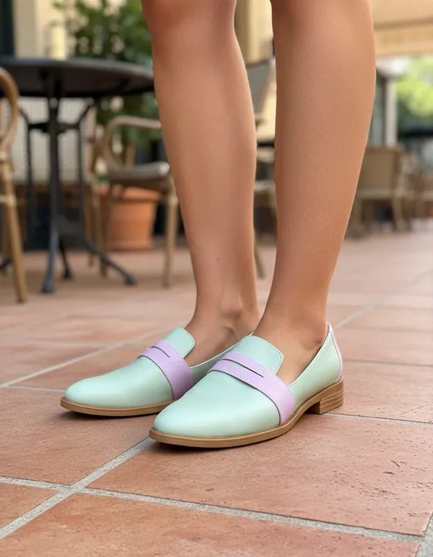 ZAPATOS MOCASINES CHATITAS IORIS VERDE AGUA VINCHA LILA Y TALONERA LILA