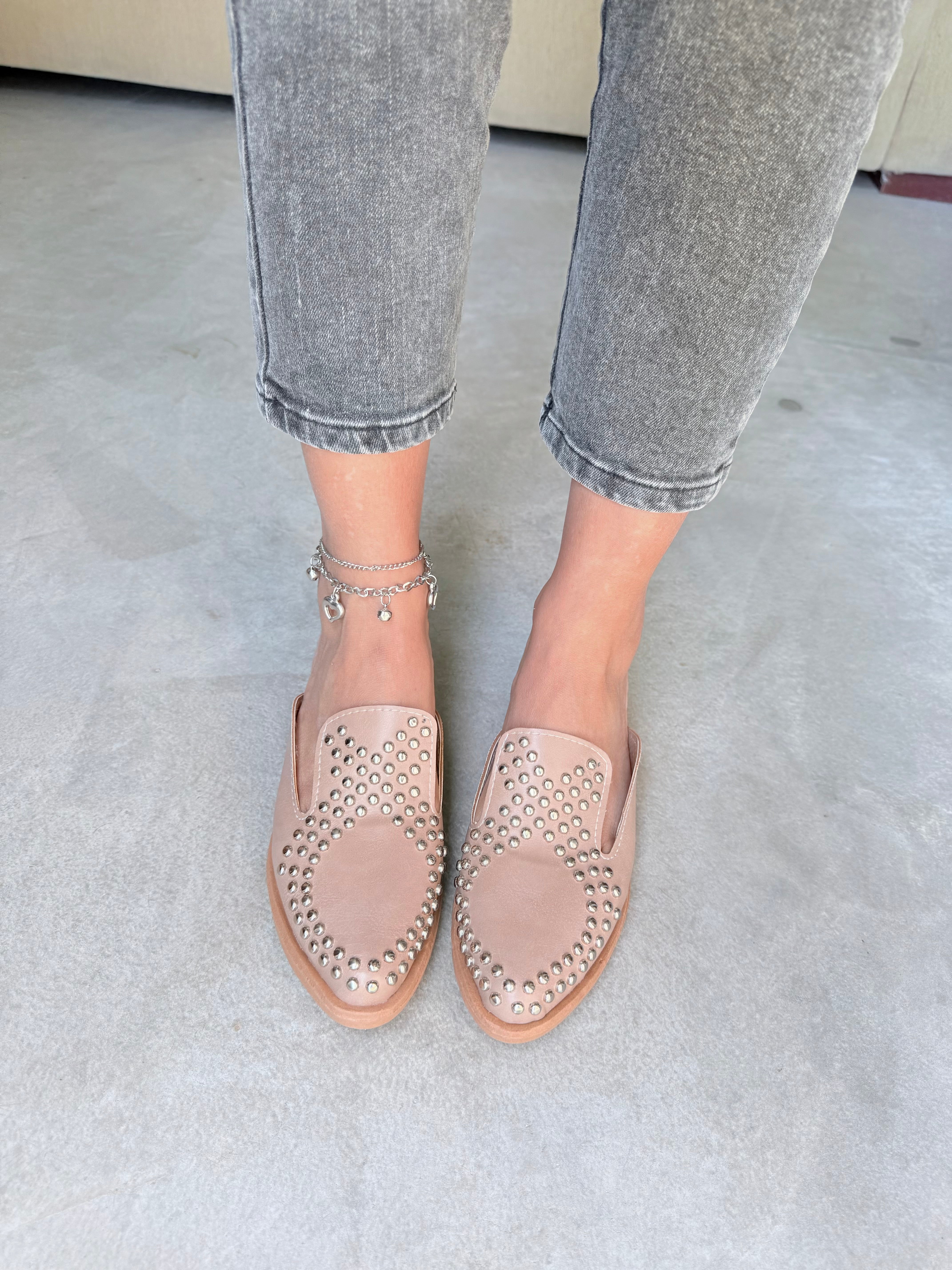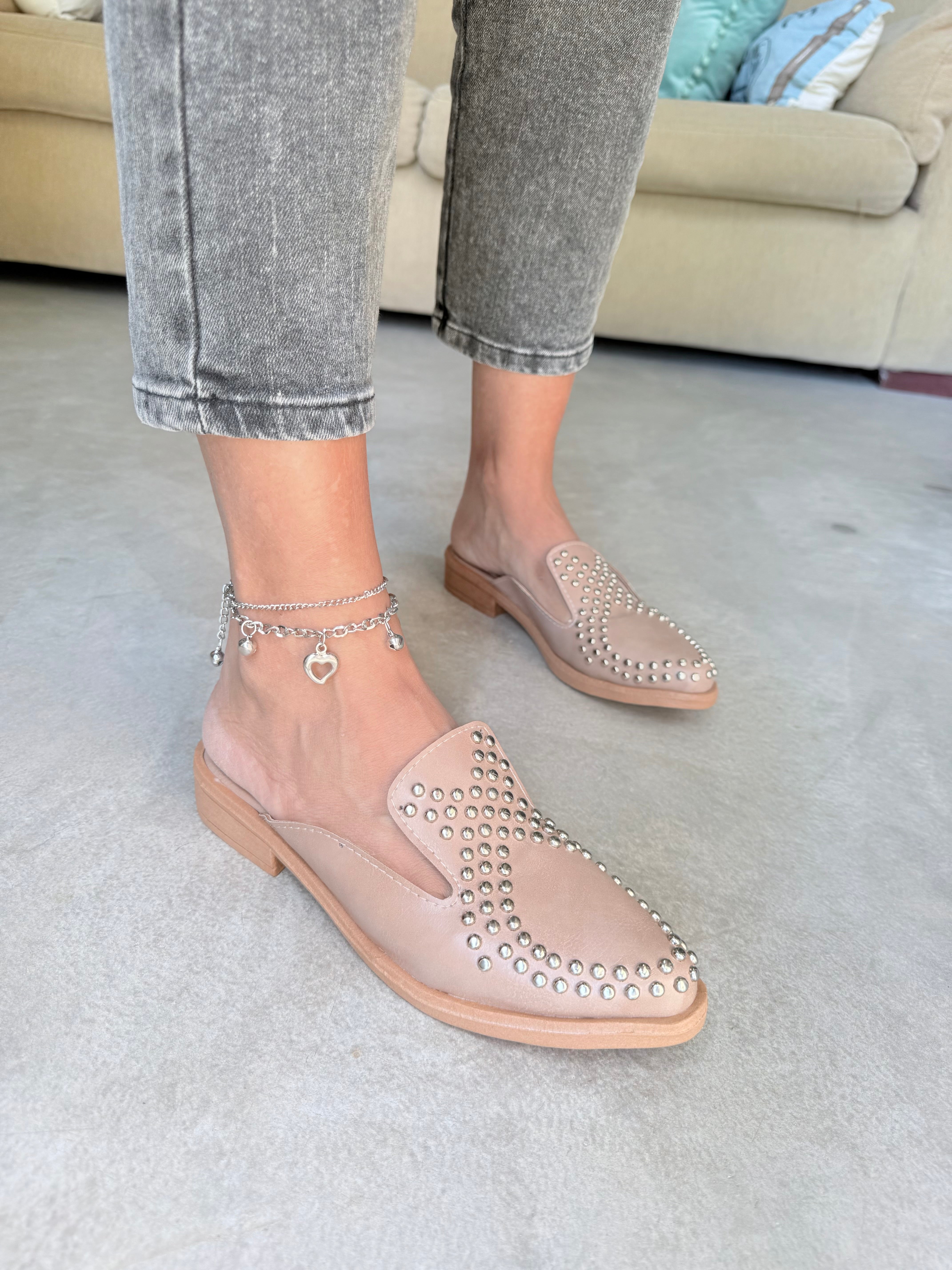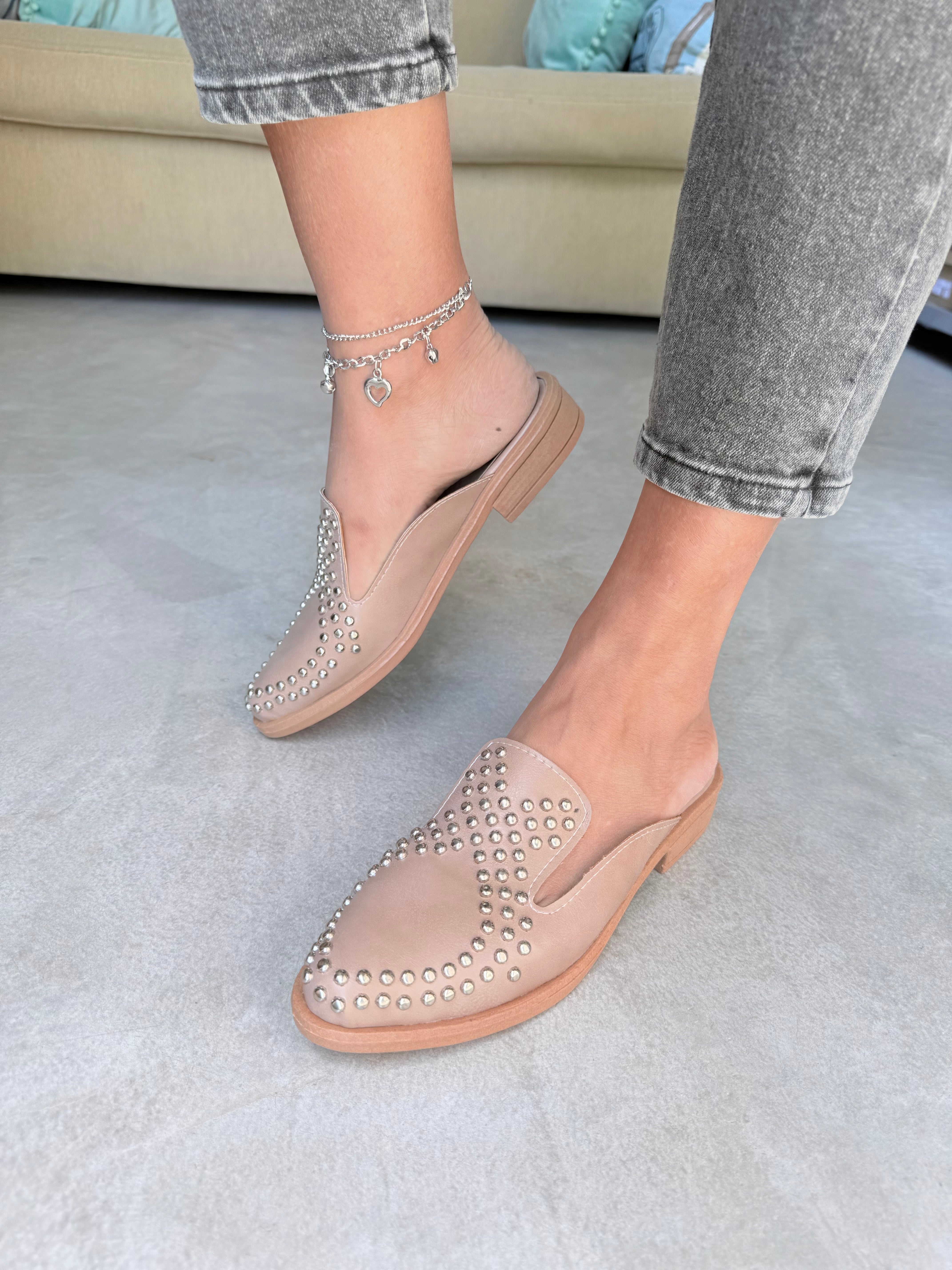 Mod.01 (MERI) INFORMACIÓN DEL PRODUCTO Color: Vison Material: Cuero Ecológico  Detalle: Tachas redondas en color Plata Taco: 2cm. Horma Estándar (Sugerimos tu talle habitual)